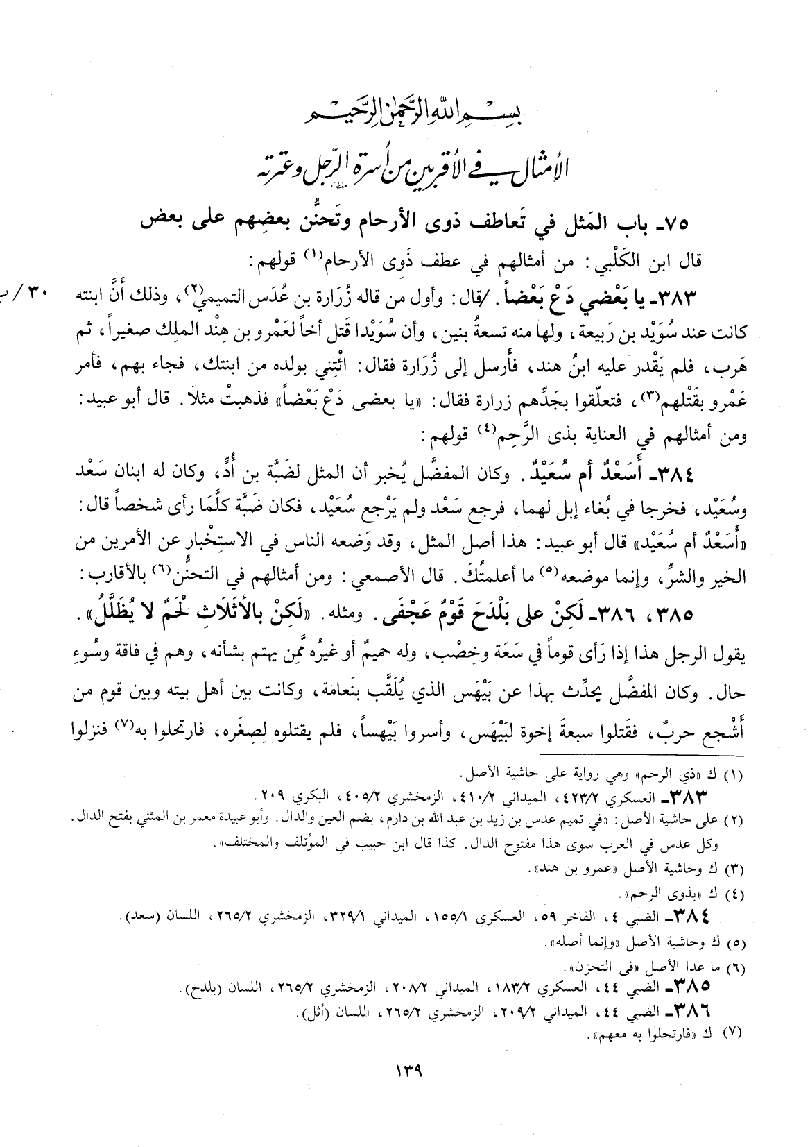قال: وأوّل من قاله زرارة بن عدس التميمي، وذلك أنَّ ابنته كانت عند سويد بن ربيعة، ولها منه تسعة بنين، وإنَّ سويدا قتل أخا لعمرو بن هند الملك صغيرا، ثم هرب فلم يقدر عليه أبن هند، فأرسل إلى زرارة فقال: ائتني بولده من أبنتك، فجاء بهم، فأمر عمرو بقتلهم، فتعلقوا بجدهم زرارة فقال: " يا بعضي دع بعضاً " فذهبت مثلا. قال أبو عبيد: ومن أمثالهم في العناية بذي الرحم قولهم: أسعد أم سعيد.