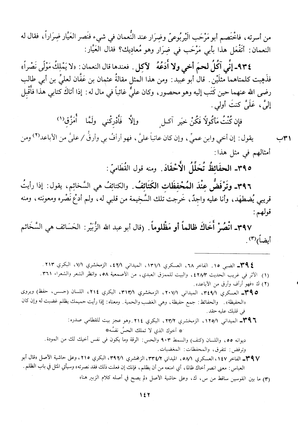 ومنه قول القطامي: وترفض عند المحفظات الكتائف. والكتائف هي السخائم، ويقول: إذا رأيت قريبي يضطهد، وأنا عليه واجد، خرجت تلك السخيمة من قلبي له، ولم أدع نصره ومعونته، ومنه قولهم: أنصر أخاك ظالما أو مظلوماً.