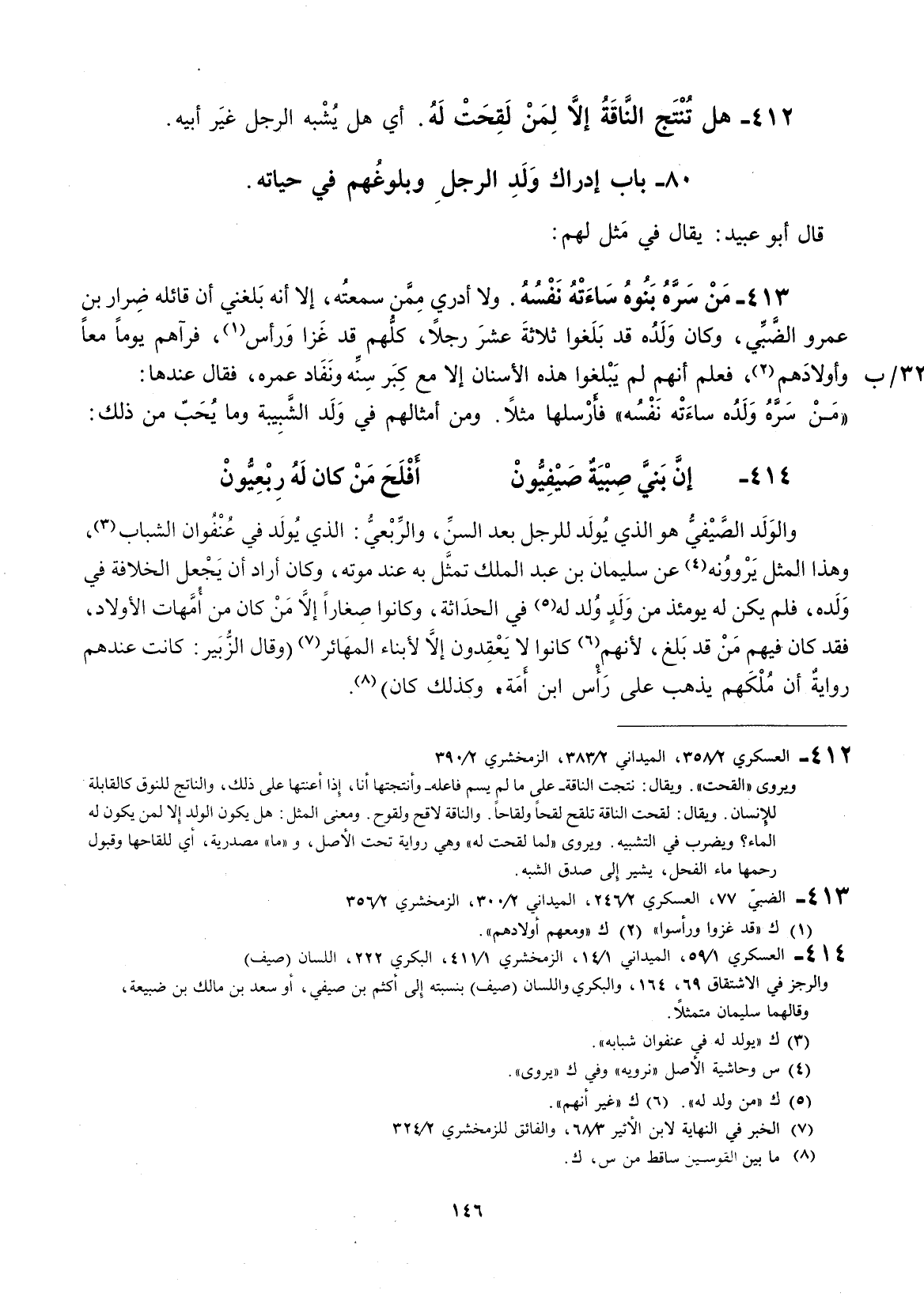 ولا أدري ممن سمعته، إلاّ أنه بلغني أنَّ قائله ضرار بن عمرو الضبي، وكان ولده قد بلغوا ثلاثة عشر رجلاً، كلهم قد غزوا ورأس، فرآهم يوماً معاً وأولادهم، فعلم أنهم لم يبلغوا هذه السن إلاّ مع كبر سنه ونفاد عمره، فقال عندها: " من سره ولده ساءته نفسه " فأرسلها مثلاً. ومن أمثالهم في ولد الشبيبة وما يجب من ذلك: