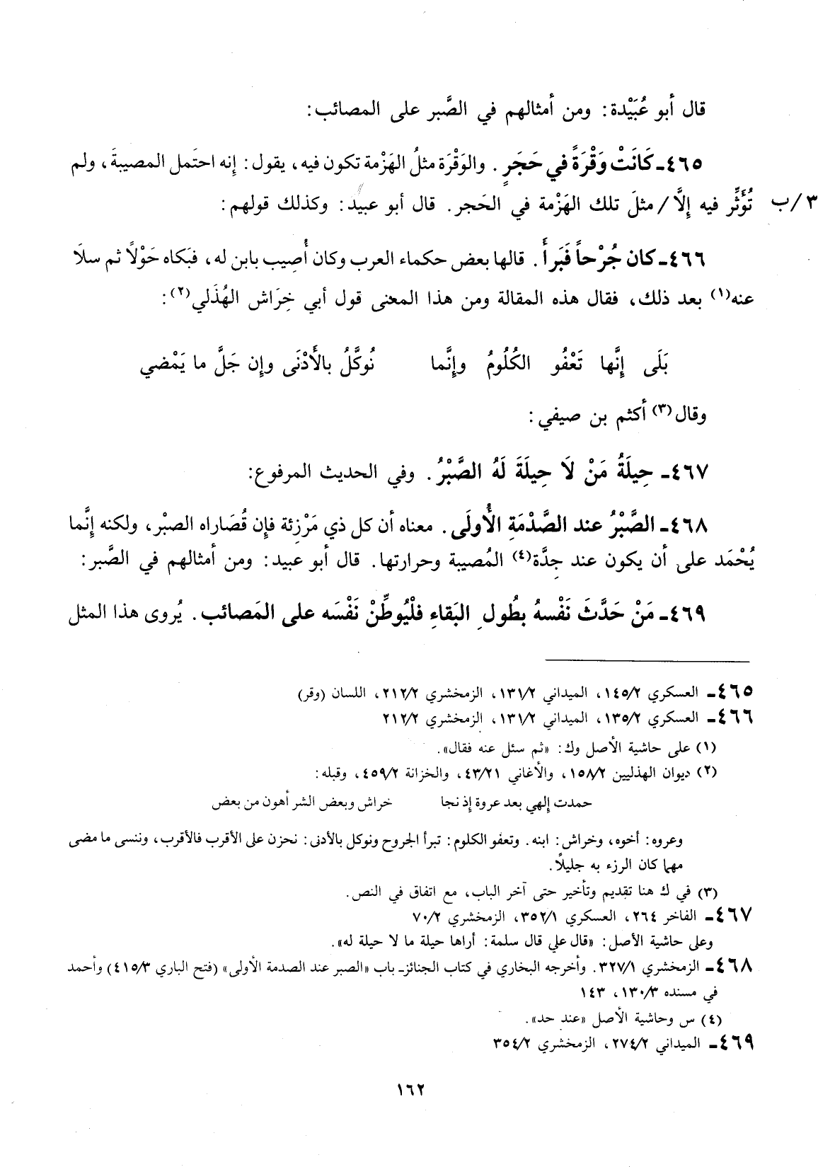 قال أبو عبيد: ومن أمثالهم في الصبر على المصائب: كانت وقرة في حجرٍ والوقرة مثل الهزمة تكون فيه يقول: إنّه احتمل المصيبة، ولم تؤثر فيه إلاّ مثل تلك الهزمة في الحجر. قال أبو عبيد: وكذلك قولهم: كان جرحا فبرأ.