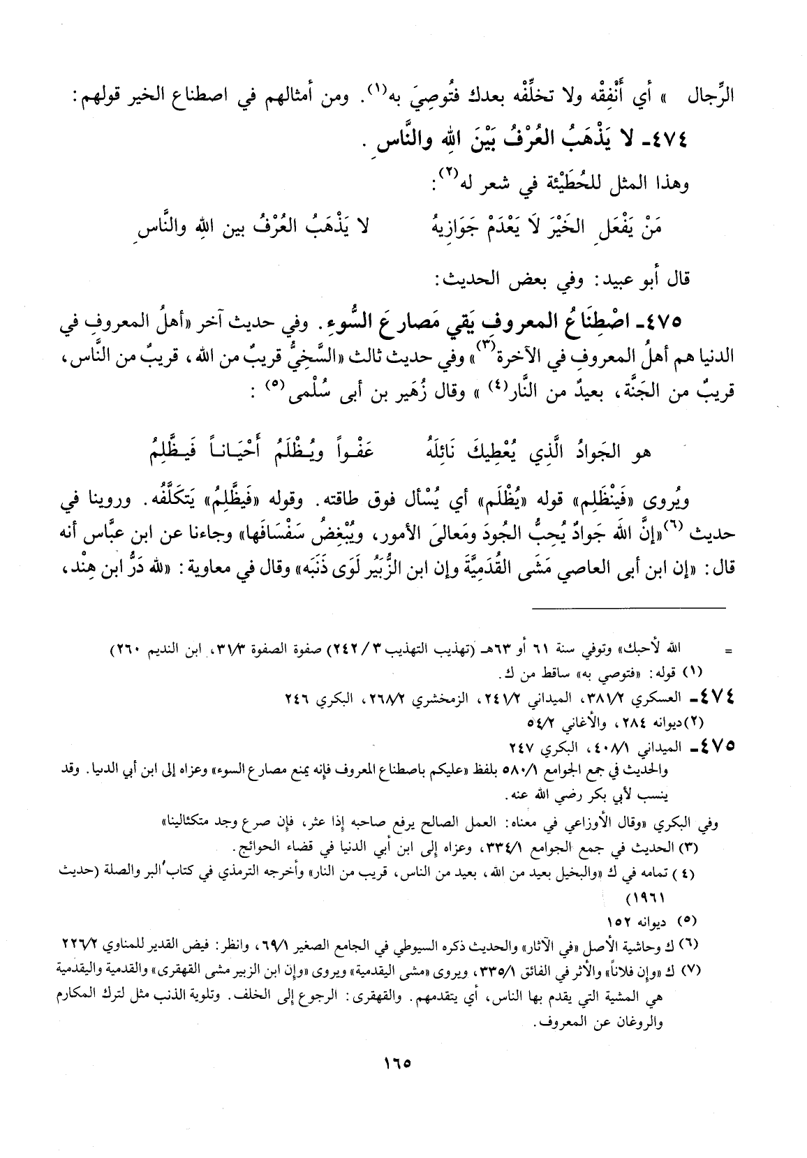 وفي حديث آخر " أهل المعروف في الدنيا هم أهل المعروف في الآخرة " وفي حديث ثالث " السخي قريب من الله، قريب من الناس، قريب من الجنة، بعيد من النار " وقال زهير بن أبي سلمى:
