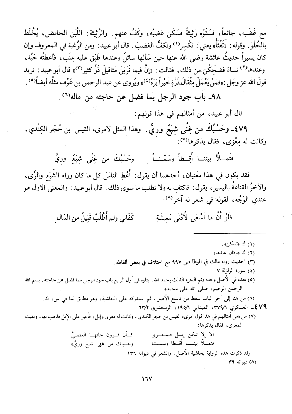 قال أبو عبيد: من أمثالهم في هذا قولهم: وحسبك من غنى شبع وري.