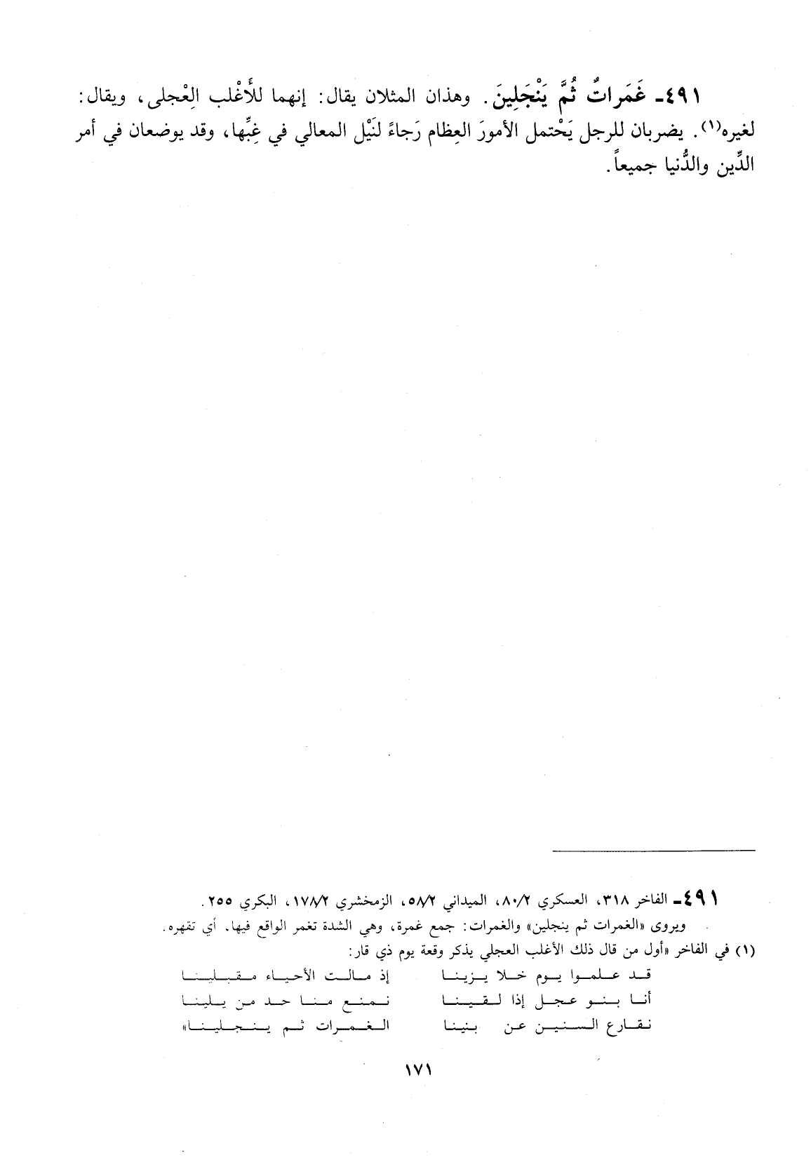 وهذان المثلان يقال: انهما لأغلب العلجي، ويقال: لغيره. يضربان للرجل يحتمل الأمور العظام رجاءً لنيل المعالي في غبها، وقد يوصفان في أمر الدين والدنيا جميعاً.