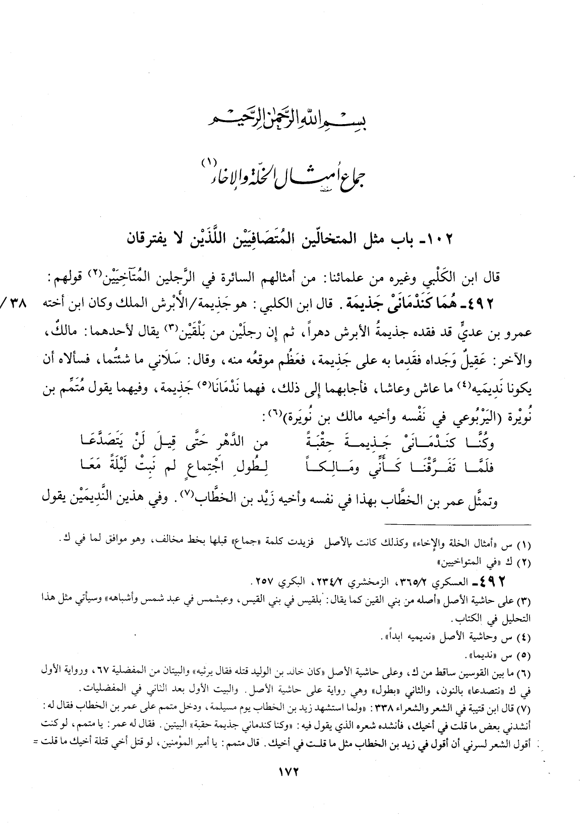 قال أبن الكلبي وغيره من علمائنا: من أمثالهم السائرة في الرجلين المتآخيين قولهم: هما كندمانى جذيمة.