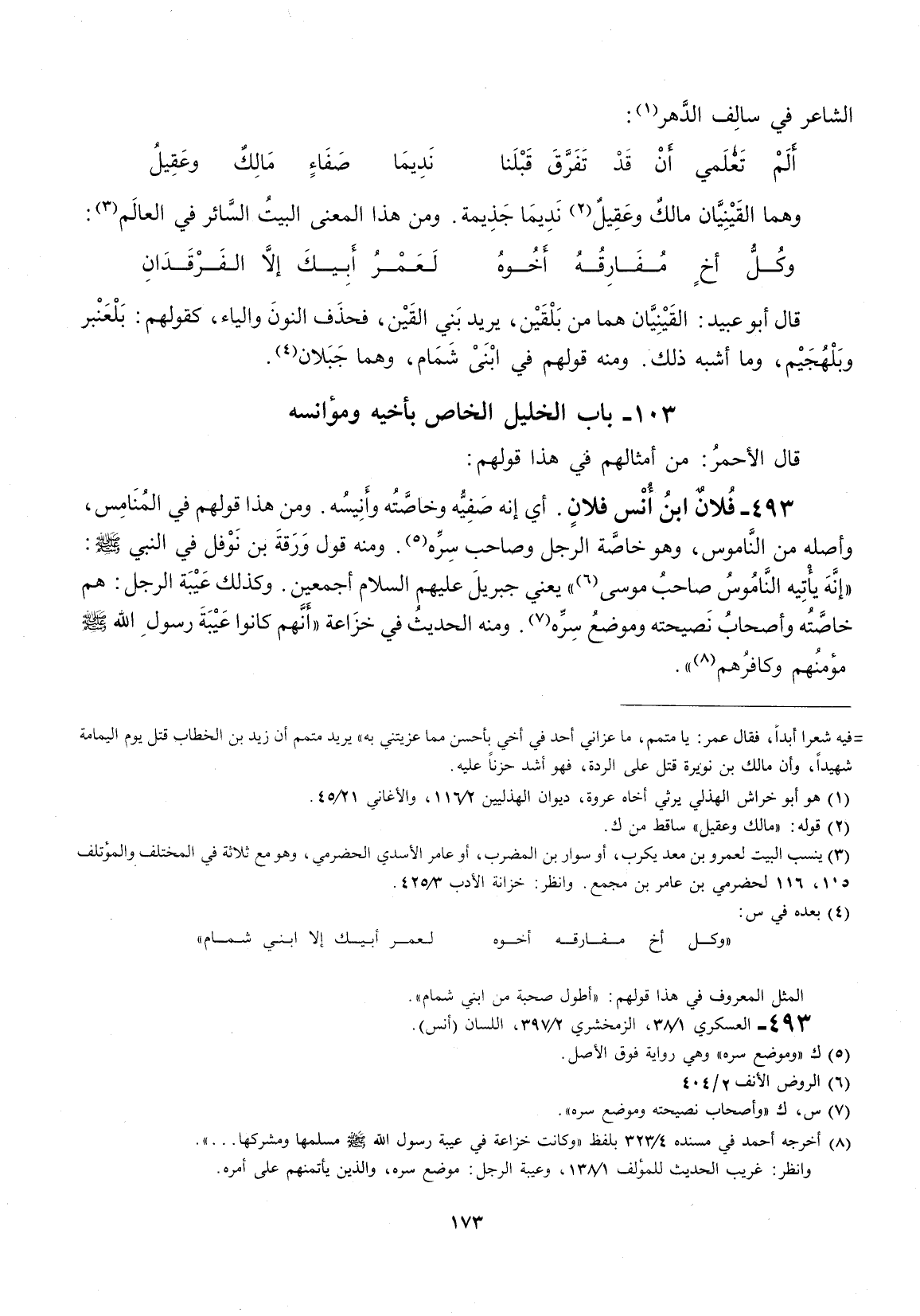 قال الأحمر: من أمثالهم في هذا قولهم: فلان أبن انس فلانٍ.