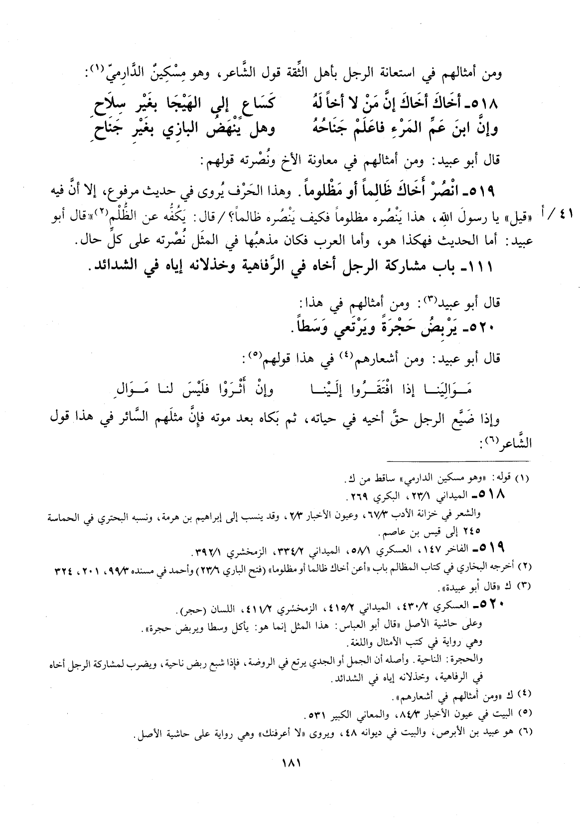 وهذا الحرف يروى في حديث مرفوع إلاّ إنَّ فيه " قيل يا رسول الله، هذا ينصره مظلوماً فكيف إذا كان ظالما؟ قال: يكفه عن الظلم " قال أبو عبيد: أما الحديث فهكذا هو، وأما العرب فكان مذهبها في المثل نصرته على كل حال.