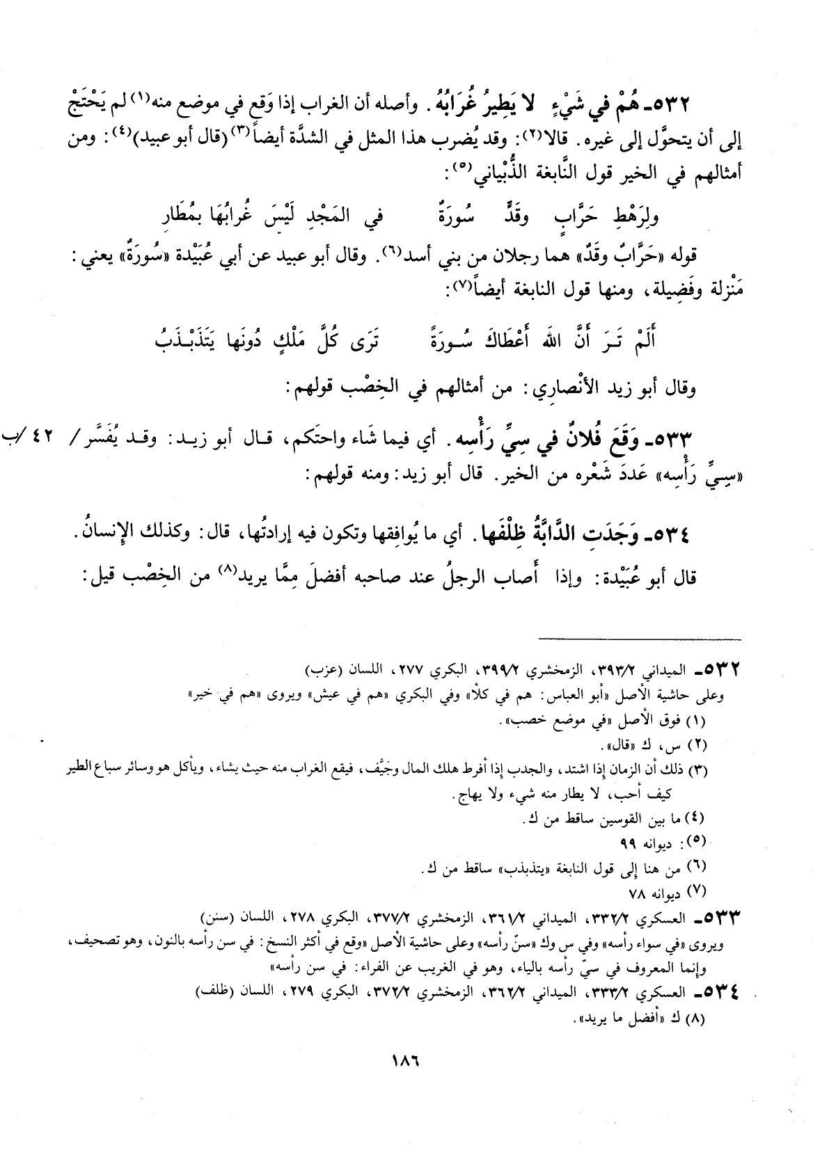 قوله " حراب وقد " هما رجلان من بني أسد. وقال أبو عبيد عن أبي عبيدة " سورة " يعني منزلة وفضيلة، ومنها قول النابغة أيضاً: