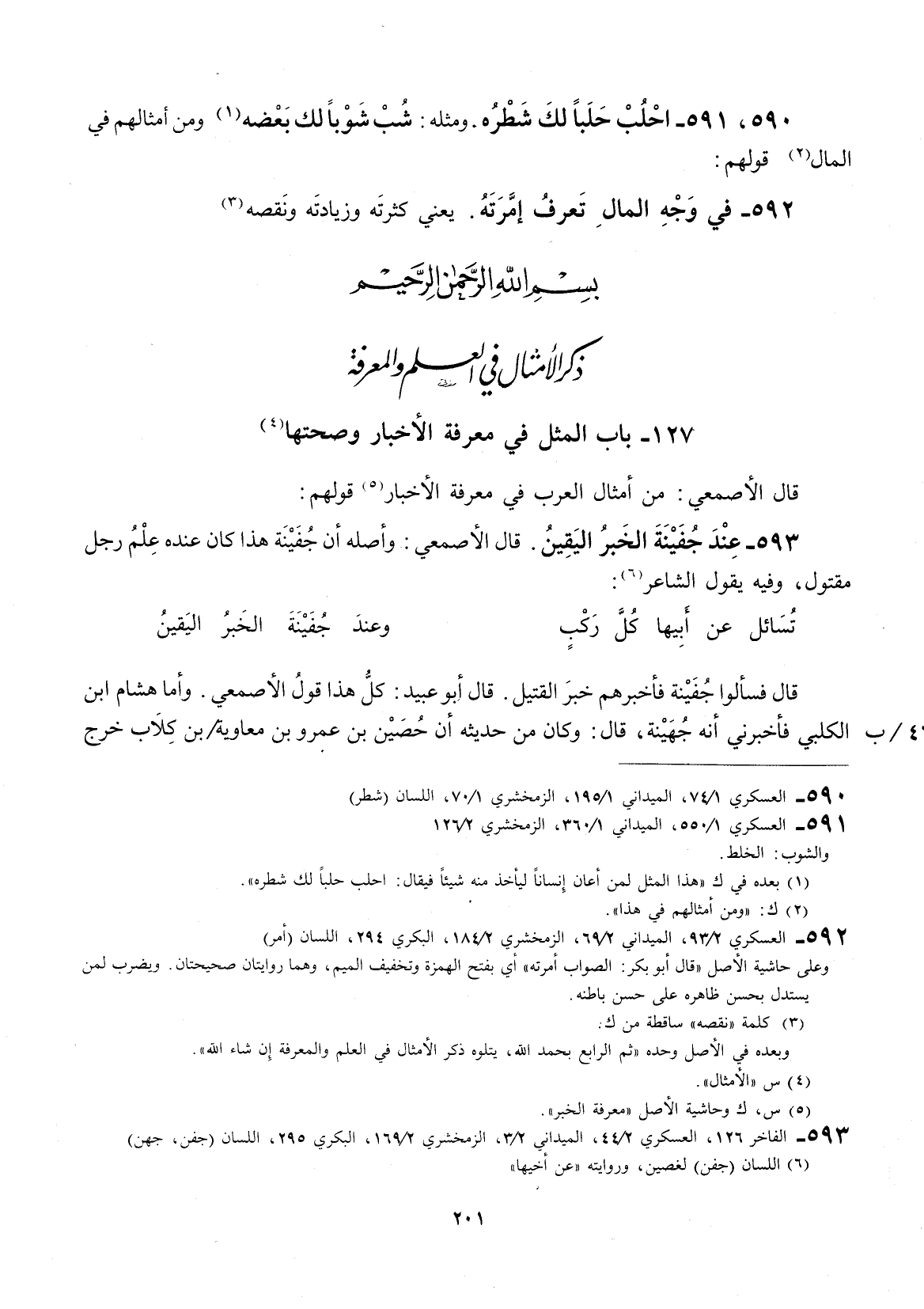 قال الأصمعي: من أمثال العرب في معرفة الأخبار قولهم: عند جفينة الخبر اليقين.