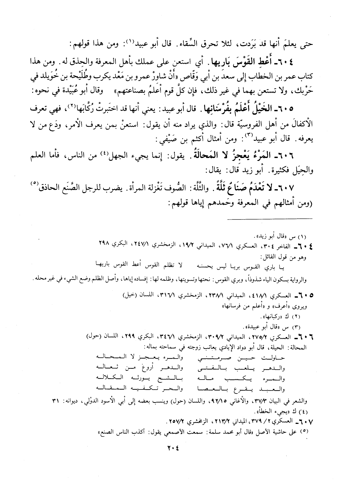 أي استعن على عملك بأهل المعرفة والحذق له. ومن هذا كتاب عمر بن الخطاب إلى سعد بن أبي وقاص " أن شاور عمرو بن معد يكرب وطليحة بن خويلد في حربك، ولا تستعن بهما في غير ذلك، فإنَّ كل قوم أعلم بصناعتهم " وقال أبو عبيدة في نحوه: الخيل أعلم بفرسانها.