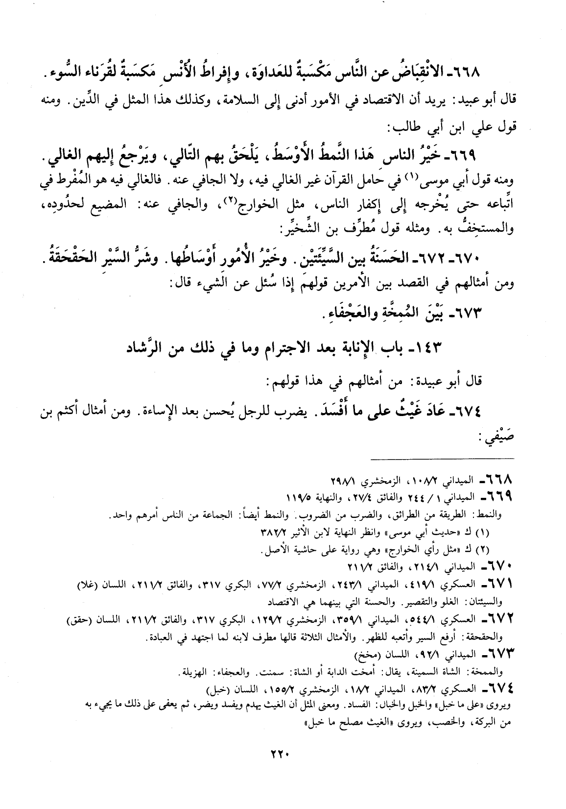 قال أبو عبيد: يريد أنَّ الاقتصاد في الأمور أدنى إلى السلامة، وكذلك هذا المثل في الدين ومنه قول علي بن أبي طالب: خير الناس هذا النمط الأوسط، يلحق بهم التالي، ويرجع إليهم الغالي ومنه قول أبي موسى في حامل القرآن غير الغالي فيه، ولا الجافي عنه. فالغالي فيه هو المفرط في اتباعه حتى يخرجه إلى إكفار الناس، مثل الخوارج، والجافي عنه: المضيع لحدوده، والمسخف به. ومثله قول مطرف بن الشخير: الحسنة بين سيئتين وخير الأمور أوساطها. وشر السير الحقحقة.