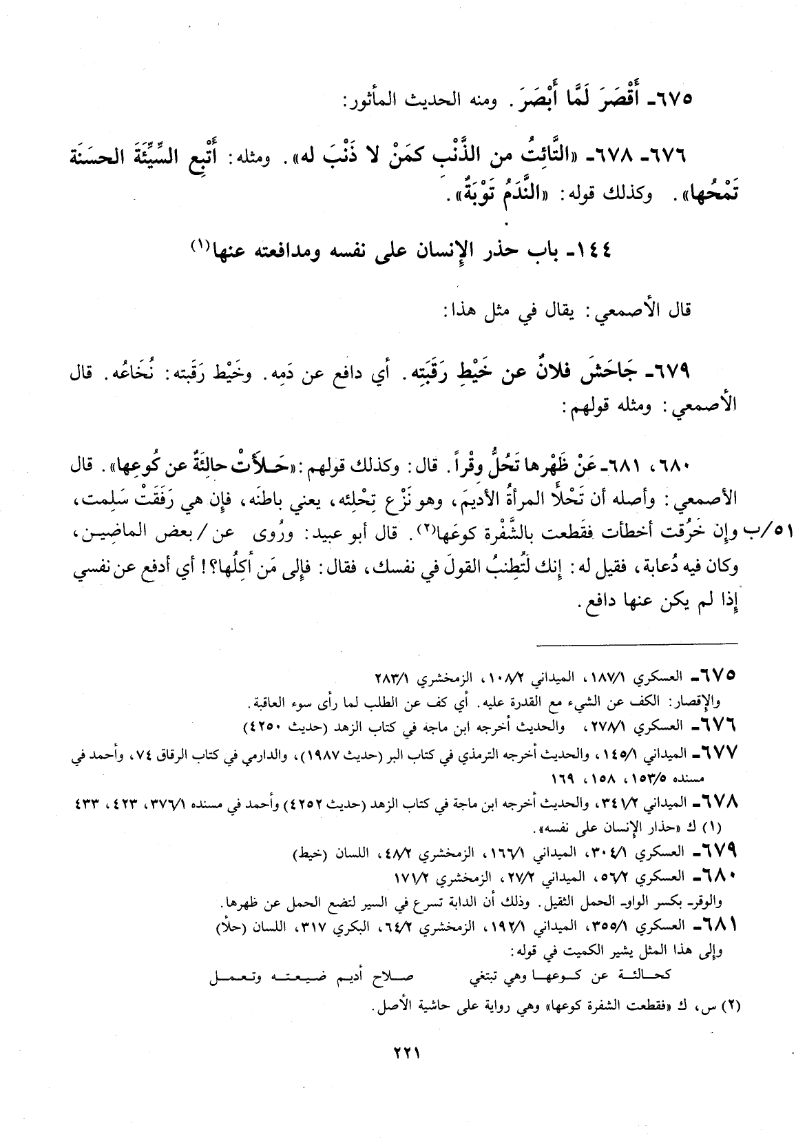 قال: وكذلك قولهم: حلأت حالئه عن كوعها. قال الأصمعي: وأصله أنَّ تحلا المرأة الأديم، وهو نزع تحلئه، يعني باطنه، فإنَّ هي رفقت سلمت، وإنَّ خرقت أخطأت فقطعت بالشفرة كوعها. وقال أبو عبيد: وروى عن بعض الماضين، ومثال فيه دعابة، فقيل له: انك لتنطب القول في نفسك، فقال: فإلي من أكلها؟! الذي ادفع عن نفسي إذا لم يكن عنها دافع.