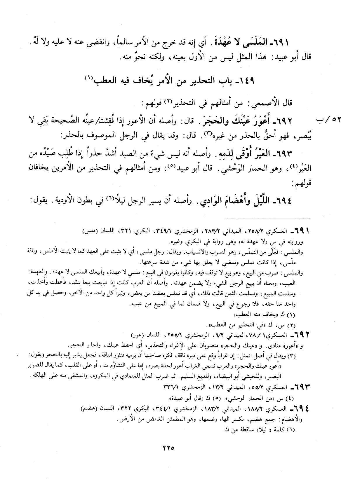 قال: واصله إنَّ الأعور إذا فقئت عينه الصحيحة بقي لا يبصر، فهو أحق بالحذر من غيره. قال: وقد يقال في الرجل الموصوف بالحذر: العير أوقى لدمه.