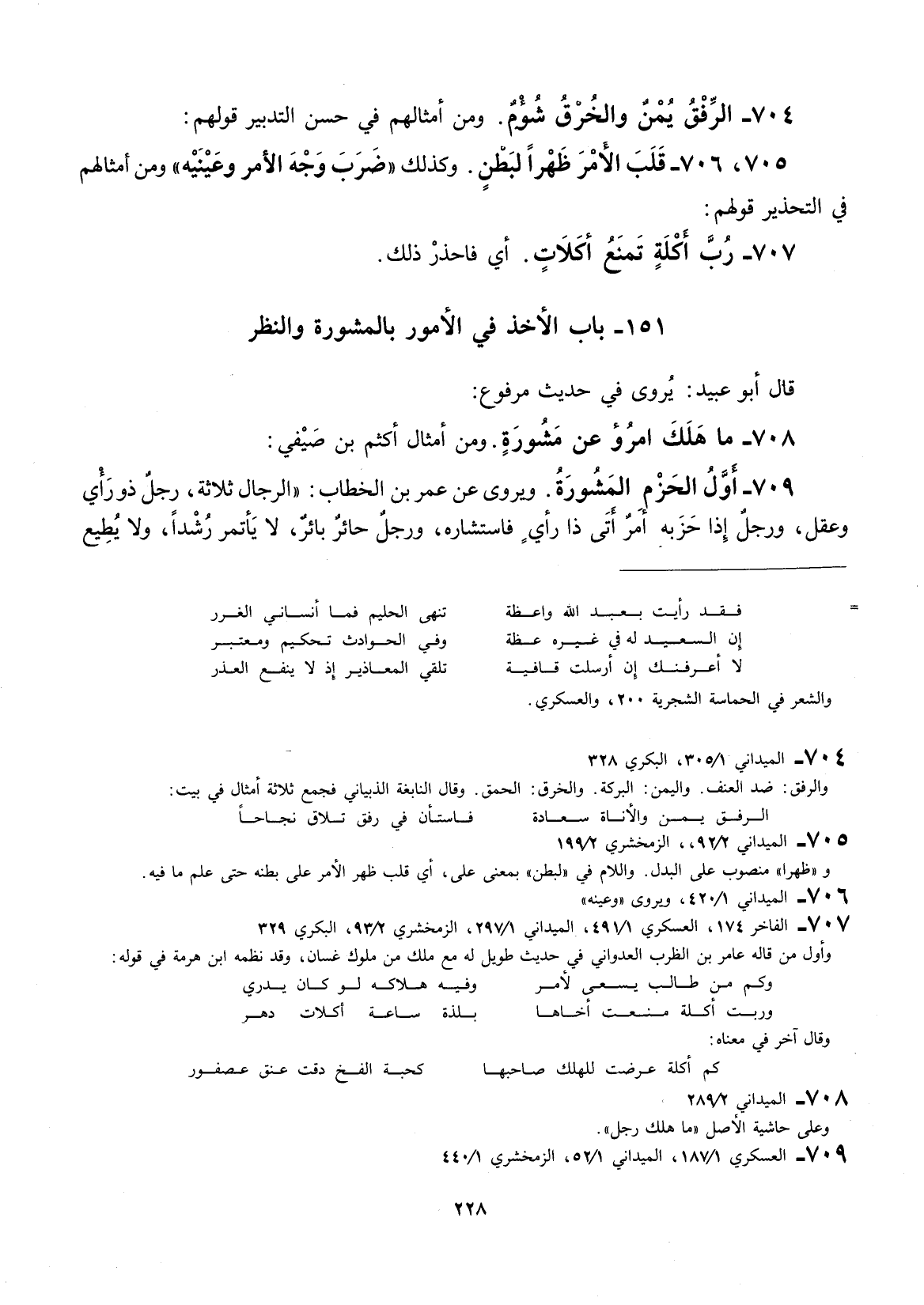 ومن أمثالهم في حسن التدبير قولهم: قلب الأمر ظهر البطن وكذلك " ضرب وجه الأمر وعينيه " ومن أمثالهم في التحذير قولهم: رب أكلة تمنع أكلات.