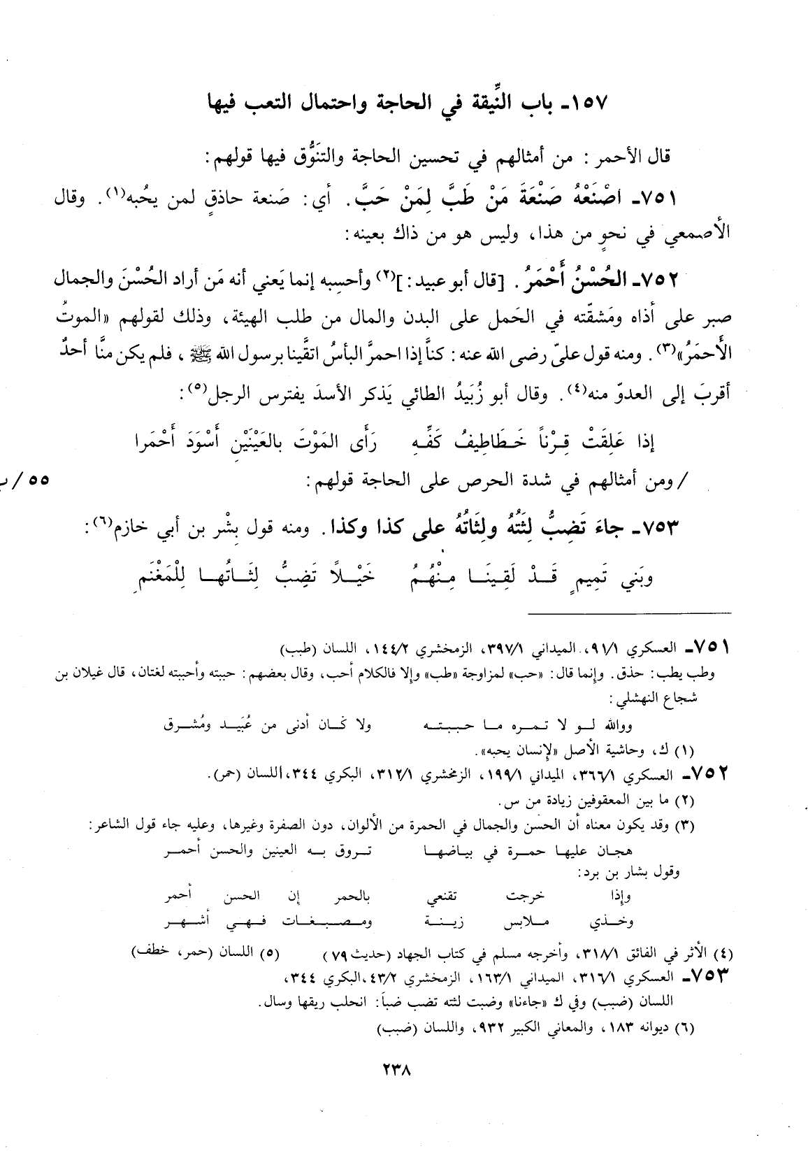 قال أبو عبيد: وأحسبه إنّما يعني إنّه من أراد الحسن والجمال صبر على أذاه ومشقته في الحمل على البدن والمال من طلب المهيئة، وذلك قولهم: " الموت الأحمر " ومنه قول علي رضي الله عنه: كنا إذا احمر البأس اتقينا برسول الله صَلَّى اللهُ عَلَيْهِ وَسَلَّمَ، فلم يكن منا أحد اقرب إلى العدو منه. وقال أبو زبيد الطائي يذكر الأسد يفترس الرجل: