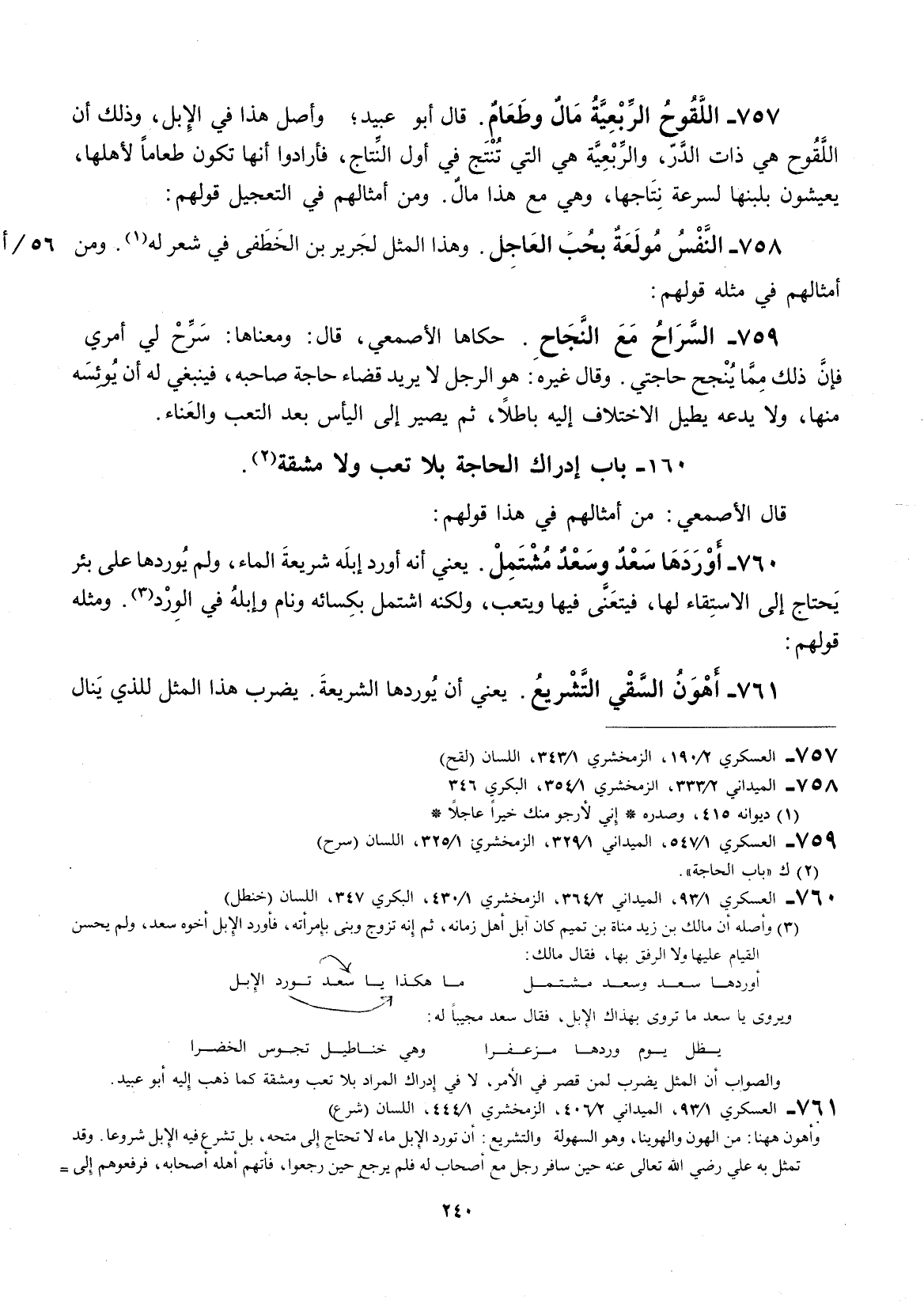 حكاها الأصمعي. قال: ومعناها: سرح لي أمري فإن ذلك مما ينجح حاجتي. وقال غيره: هو الرجل لا يريد قضاء حاجة صاحبه، فينبغي له إنَّ يوئسه منها، ولا يدعه يصيل الاختلاف إليه باطلاً، ثم يصير إلى اليأس بعد التعب والعناء.