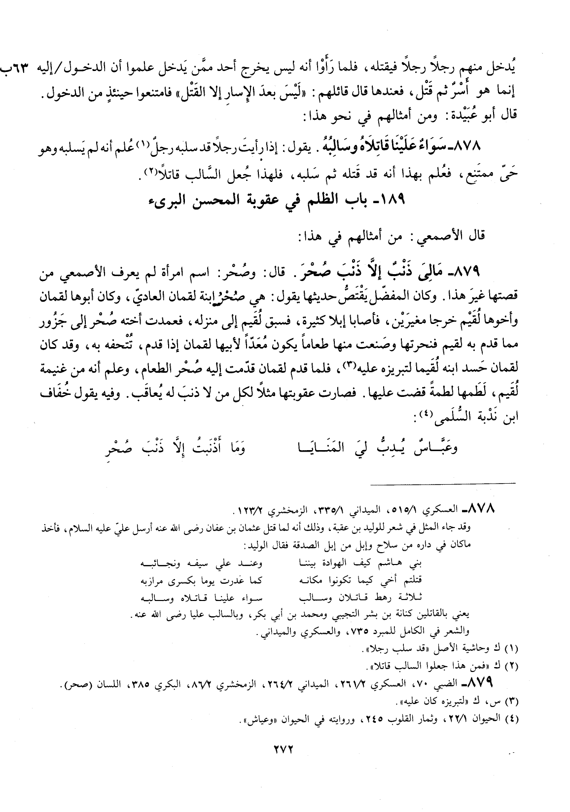 قال: وصحر اسم امرأة لم يعرف الأصمعي من قصتها غير هذا. وكان المفضل يقتص حديثها يقول: هي صحر ابنه لقمان العادي، وكان أبوها لقمان وأخوها لقيم خرجا مغيرين، فأصابا إبلاً كثيرة، فسبق لقيم إلى منزله، فعمدت أخته صحر إلى جزور مما قدم به لقيم فنحرتها وصنعت منها طعاماً يكون معداً لأبيها لقمان إذا قدم: تتحف به. وقد كان لقمان حسد ابنه لقيما لتبريزه عليه، فلما قدم لقمان قدمت إليه صحر الطعام، وعلم إنّه من غنيمة لقيم، لطمها لطمة قضت عليها: فصارت عقوبتها مثلاً لكل من لا ذنب له يعاقب. وفيه يقول خفاف أبن ندبة السلمى: