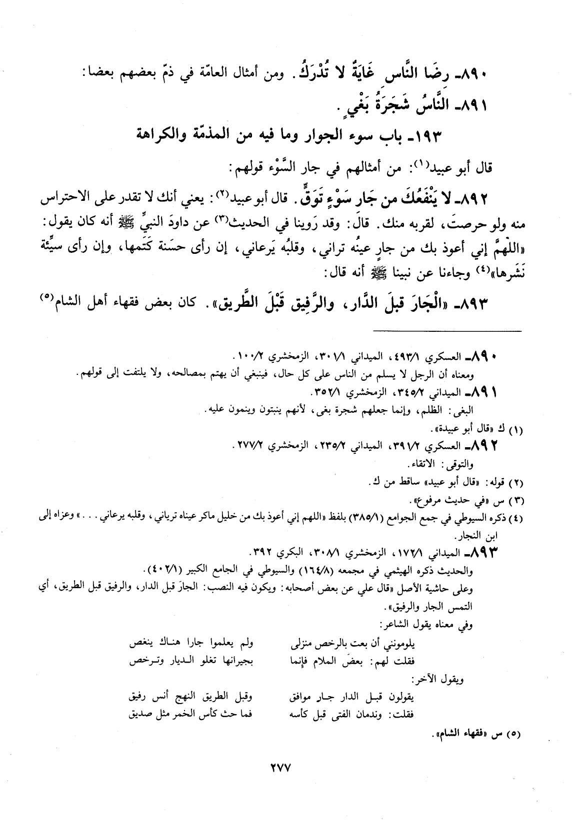 قال أبو عبيد: يعني انك لا تقدر على الاحتراس منه ولو حرصت، لقربه منك. قال: وقد روينا في الحديث عن داود النبي صَلَّى اللهُ عَلَيْهِ وَسَلَّمَ إنّه كان يقول: " اللهم إني أعوذ بك من جار عينه تراني، وقلبه يرعاني، إنَّ رأى حسنة كتمها، وإنَّ رأى سيئة نشرها " وجاءنا عن نبينا صَلَّى اللهُ عَلَيْهِ وَسَلَّمَ إنّه قال: " جارك قبل دارك، والرفيق قبل الطريق ".