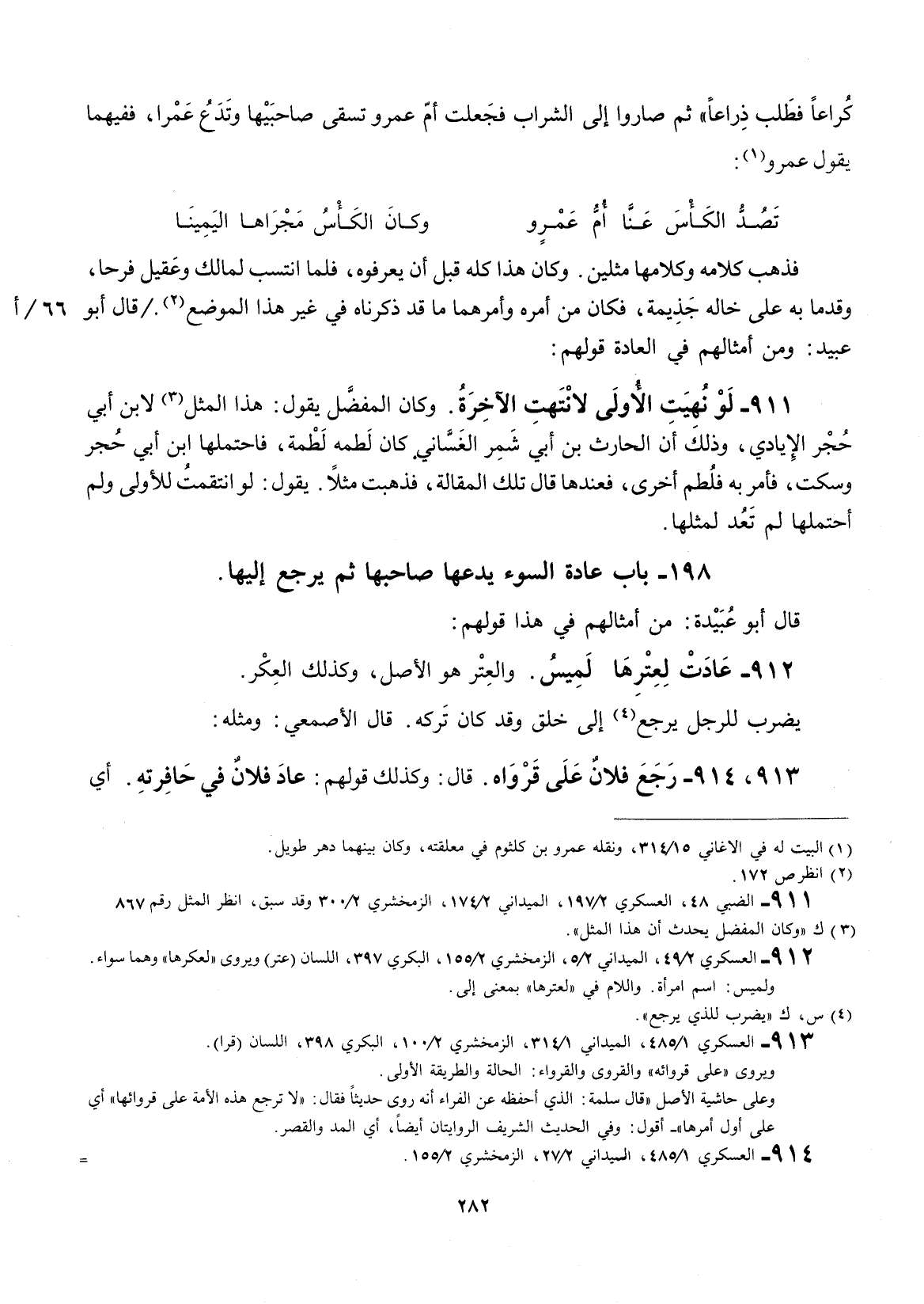 فذهب كلامه وكلامها مثلين، وكان هذا كله قبل أنَّ يعرفوه، فلما انتسب لمالك وعقيل فرحا، وقدما به إلى خاله جذيمة، فكان من أمره وأمرهما ما قد ذكرناه في غير هذا الموضع. قال أبو عبيد: ومن أمثالهم في العادة قولهم: لو نهيت الأولى لانتهت الآخرة.