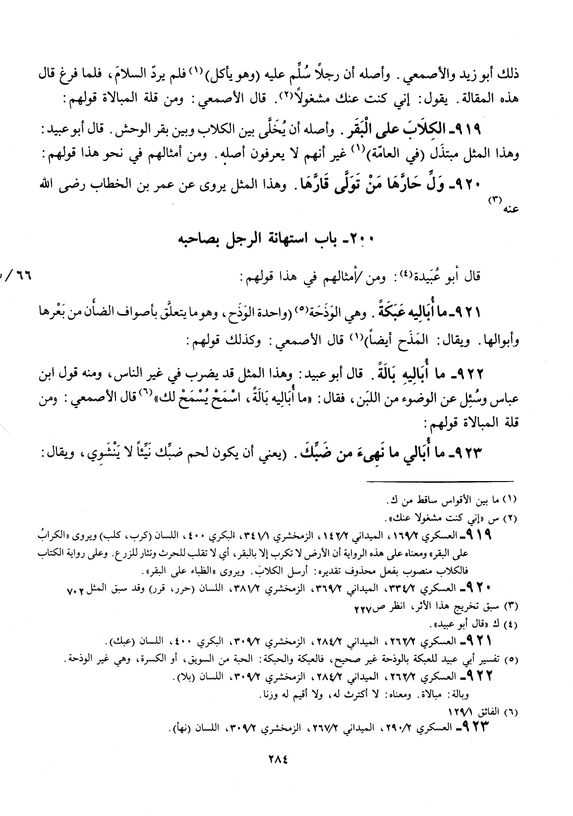 ذلك أبو زيد والأصمعي. واصله أنَّ رجلاً سلم عليه وهو يأكل فلم يرد السلام، فلما فرغ قال: هذه المقالة. يقول إني كنت مشغولاً. قال الأصمعي: ومن قلة المبالاة قولهم: الكلاب على البقر.