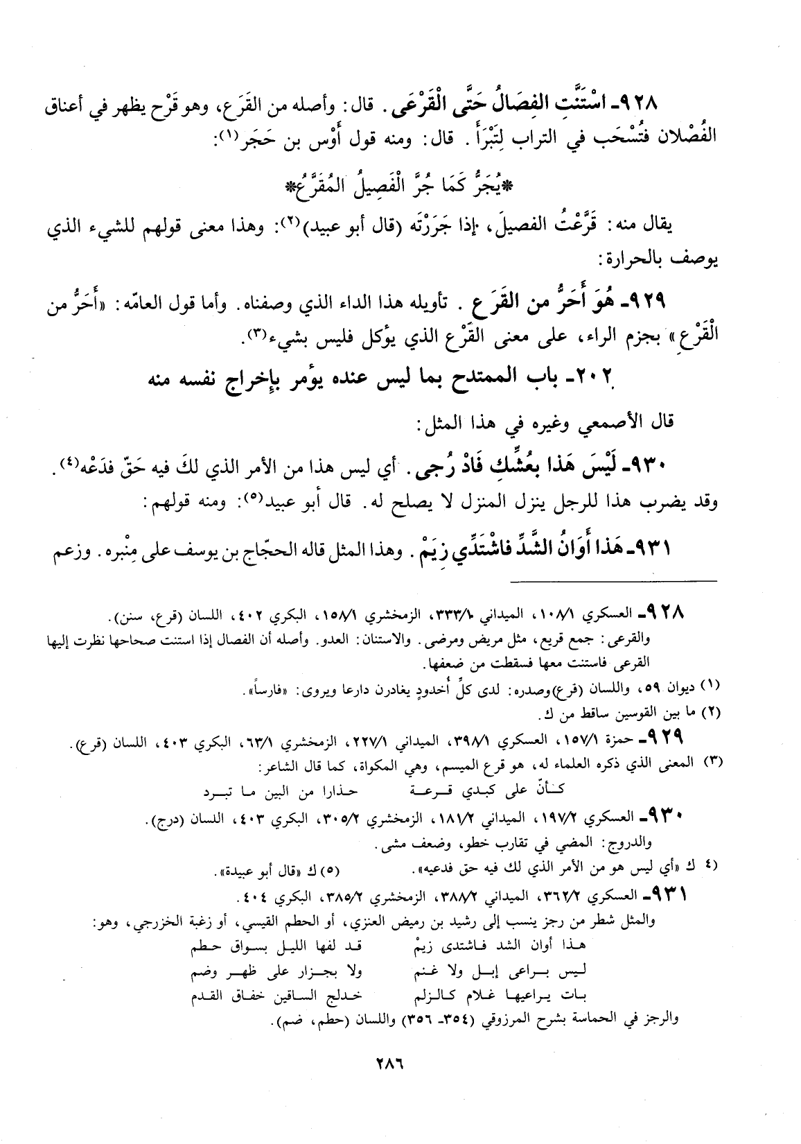 وتأويله هذا الداء الذي وصفناه. وأما قول العامة: " أحر من القرع " يجزم الراء، على معنى القرع الذي يؤكل فليس بشيء.