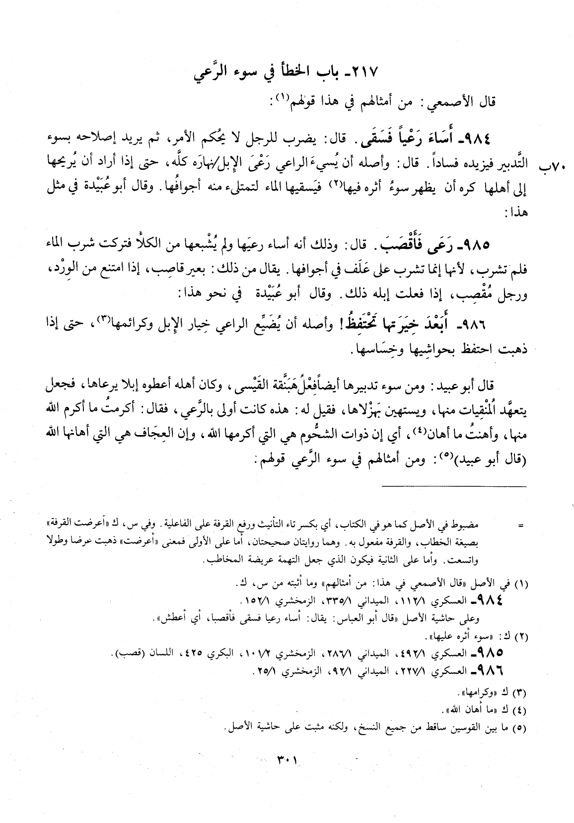 قال أبو عبيد: ومن سوء تدبيرها أيضاً فعل هبنقة القيسي، وكان أهله أعطوه إبلاً يرعاها، فجعل يتعهد المنقيات منها، ويستهين بهزلاها، فقيل له: هذه كانت أولى بالرعي، فقال: أكرمت ما أكرم الله منها، وأهنت ما أهان، أي إنَّ ذوات الشحوم هي التي أكرمها الله، وإنَّ العجاف هي التي أهانها الله. قال أبو عبيد: ومن أمثالهم في سوء الرعي قولهم: