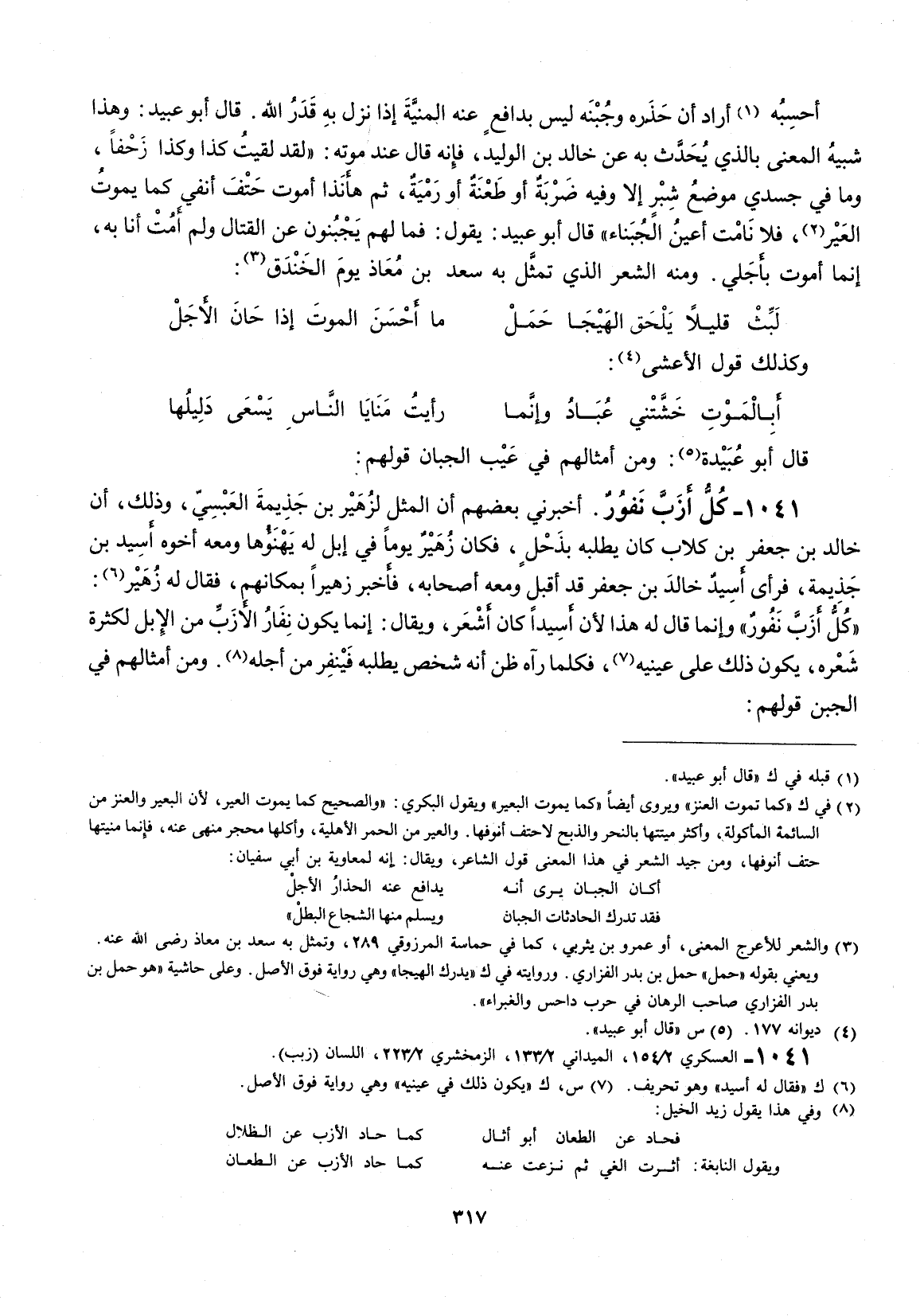 احسبه أراد أنَّ حذره وجبنه ليس بدافع عنه المنية إذا نزل به قدر الله. قال أبو عبيد: وهذا شبيه المعنى بالذي يحدث به عن خالد بن الوليد، فانه قال عند موته: " لقد لقيت كذا وكذا زحفاً وما في جسدي موضع شبر إلاّ وفيه ضربة أو طعنة أو رمية، ثم هاأنذا أموت حتف أنفي كما يموت العير، فلا نامت أعين الجبناء " قال أبو عبيد: يقول: فما لهم يجبنون عن القتال ولم أمت أنا به، إنّما أموت بأجلي. ومنه الشعر الذي تمثل به سعد بن معاذ يوم الخندق: