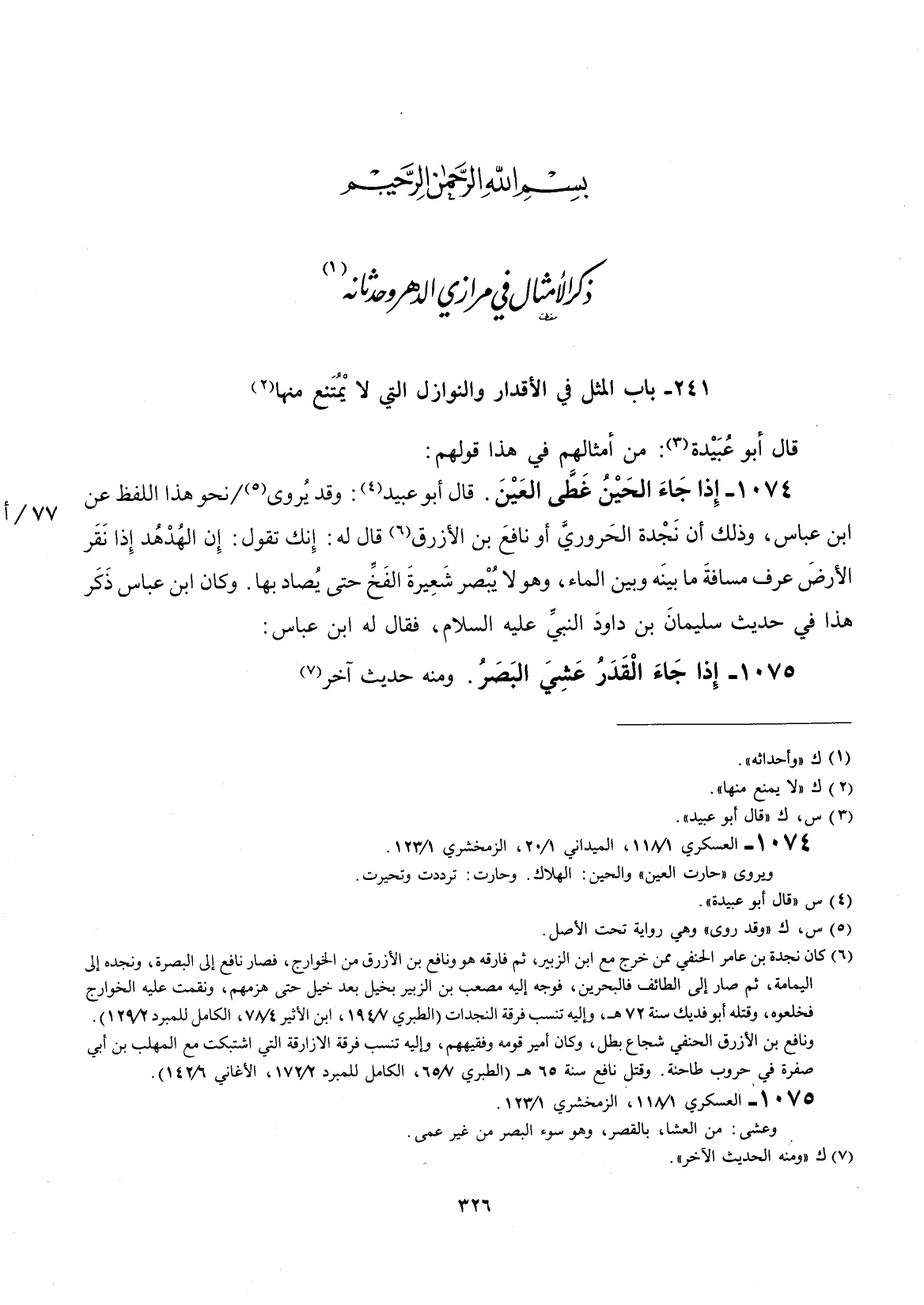 قال أبو عبيد: وقد يروى نحو هذا اللفظ عن أبن عباس، وذلك أنَّ نجدة الحروري أو نافع بن الزرق قال له: إنك يقول: إنَّ الهدهد إذا نقر الأرض عرف مسافة ما بينه وبين الماء، وهو لا يبصر شعيرة الفخ حتى يصاد بها. وكان أبن عباس ذكر هذا في حديث سليمان بن داود عليه السلام فقال له أبن عباس: إذا جاء القدر عشي البصر.