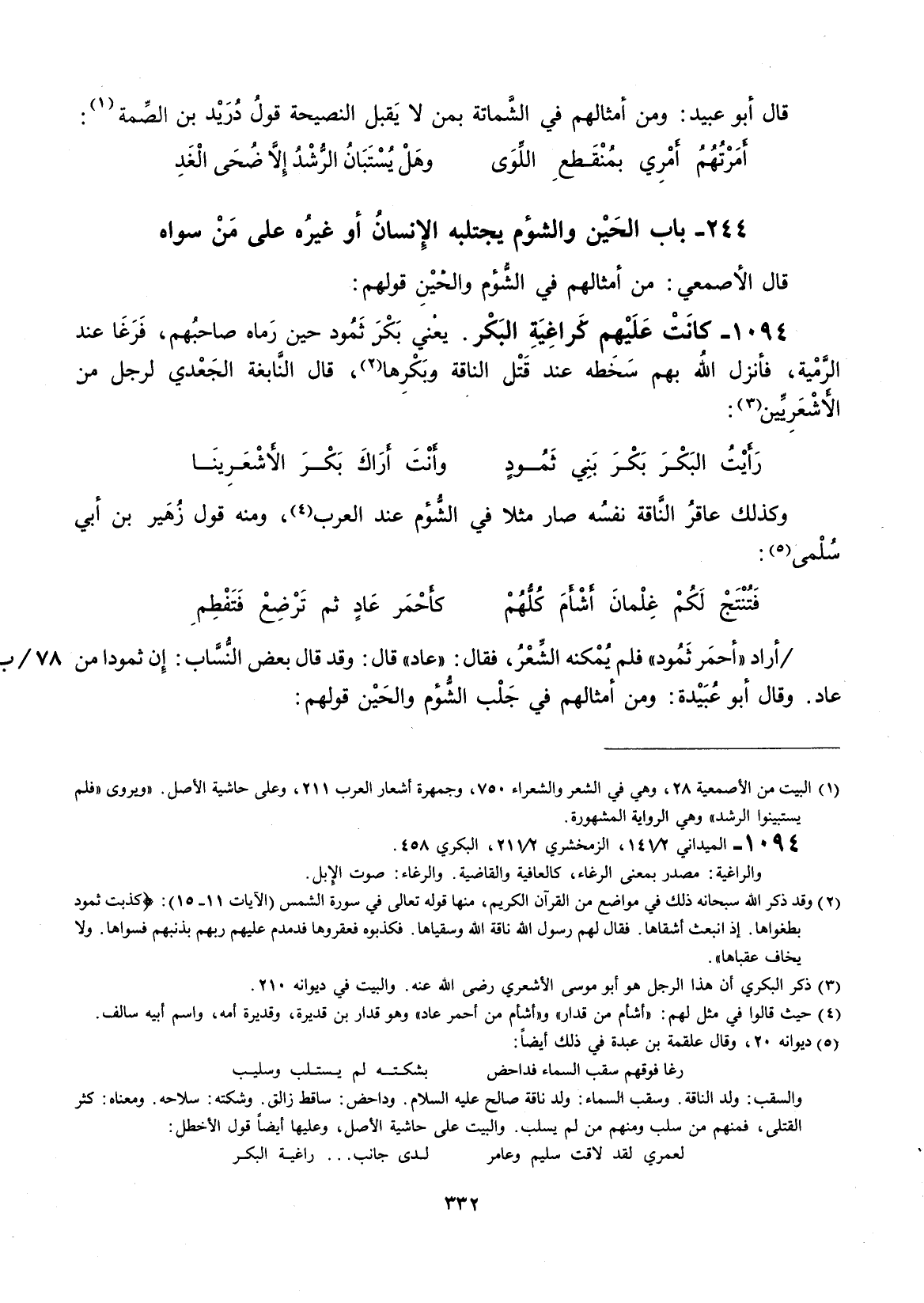أراد " أحمر ثمود " فلم يمكنه الشعر، فقال: " عاد " قال: وقد قال بعض النساب: إنَّ ثموداً من عاد. وقال أبو عبيد: ومن أمثالهم في جلب الشؤم والحين قولهم: