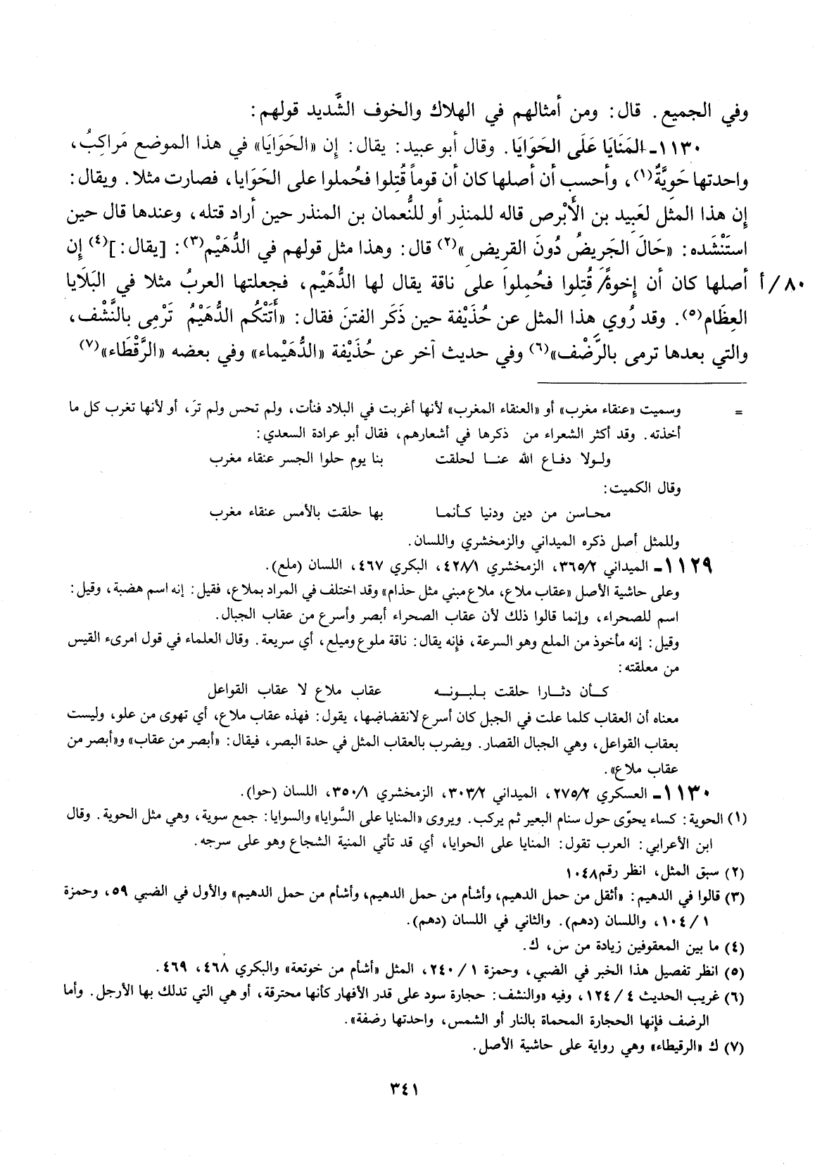 وقال أبو عبيد: يقال: إنَّ " الحوايا " في هذا الموضع مراكب، واحدتها حوية، وأحسب أنَّ اصلها كان أنَّ قوماً قتلوا فحملوا على الحوايا، فصارت مثلاً. ويقال: إنَّ هذا المثل لعبيد بن الأبرص قاله للمنذر أو النعمان بن المنذر حين قتله، وعندها قال حين استنشده: " حال الجريض دون القريض " قال: وهذا مثل قولهم في الدهيم، فجعلتها العرب مثلاً في البلايا العظام. وقد روي هذا المثل عن حذيفة حين ذكر الفتن فقال: " أتتكم الديم ترمي بالنشب، والتي بعدها ترمى بالرضف " وفي حديث آخر عن حذيفة " الدهيماء " وفي بعضه " الرقطاء "
