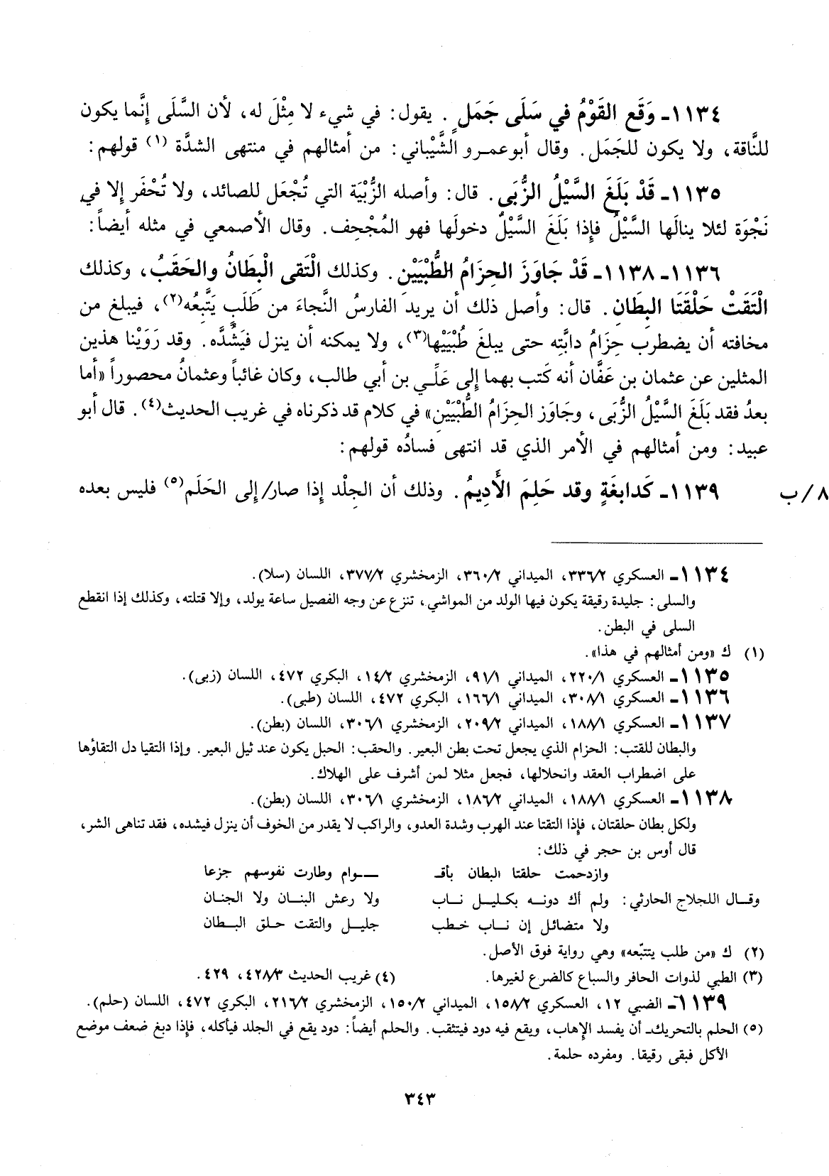 يقول: في شيء لا مثل له، لأنَّ السلى إنما يكون للناقة ولا يكون للجمل. وقال أبو عمرو الشيباني: من أمثالهم في منتهى الشدة قولهم: قد بلغ السيل الزبى قال: واصله الزبية التي تجعل للصائد، ولا تحفر إلاّ في نجوة لئلا ينالها السيل فإذا بلغ السيل دخولها فهو مجحف. وقال الأصمعي في مثله أيضاً: قد جاوز الحزام الطين وكذلك التقى البطان والحقب، وكذلك التقت حلقتا البطان.