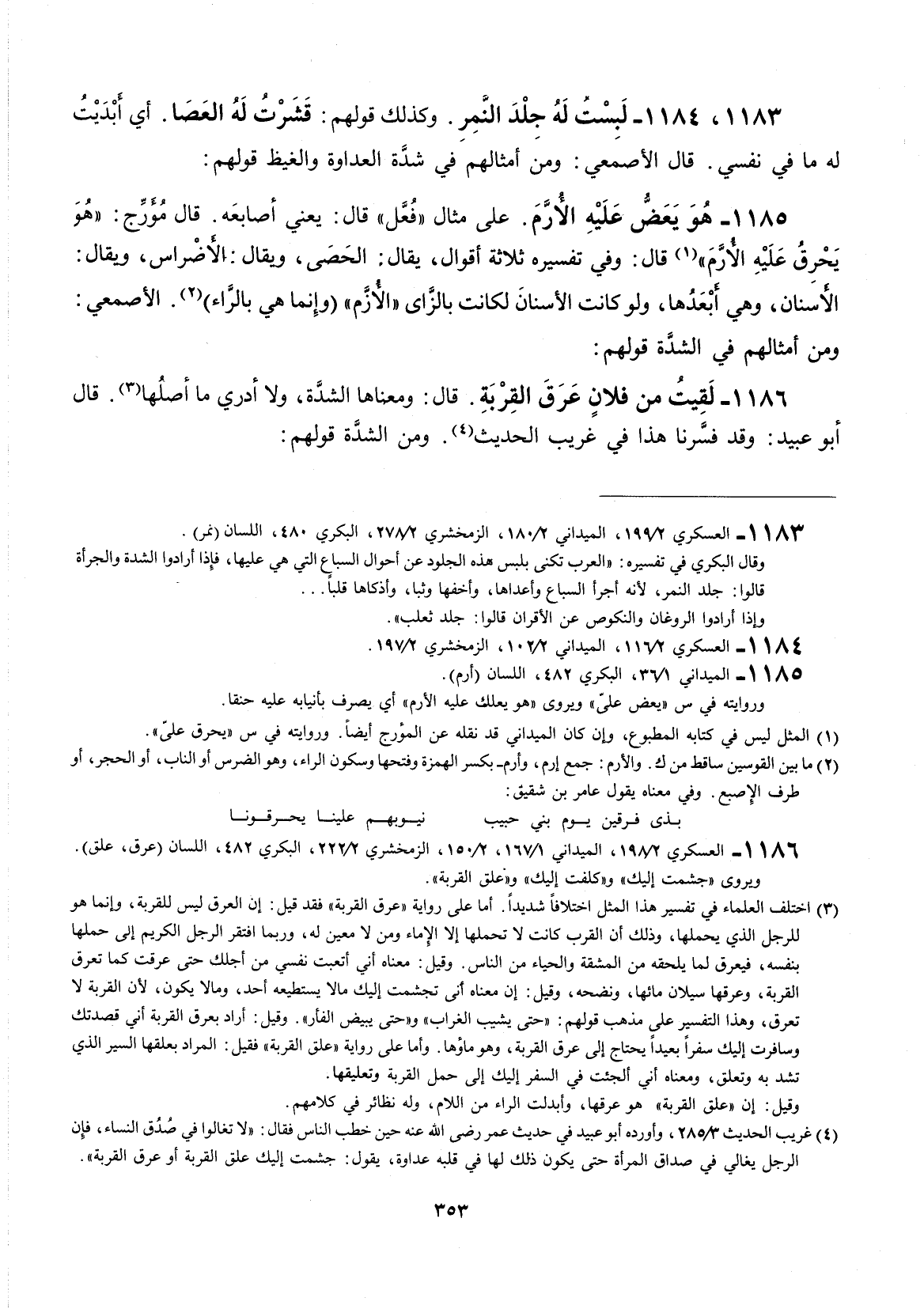 على مثال " فُعَّل " قال: يعني إصبعه. قال مؤرج: " هو يحرق عليه الأرم " قال: وفي تفسيره ثلاثة أقوال، يقال: الحصى، ويقال: الأضراس، ويقال: الأسنان، وهي أبعدها، ولو كانت الأسنان لكانت بالزاي " الأزم " وإنّما هي بالراء. قال الأصمعي: ومن أمثالهم في الشدة قولهم: لقيت من فلان عرق القربة.