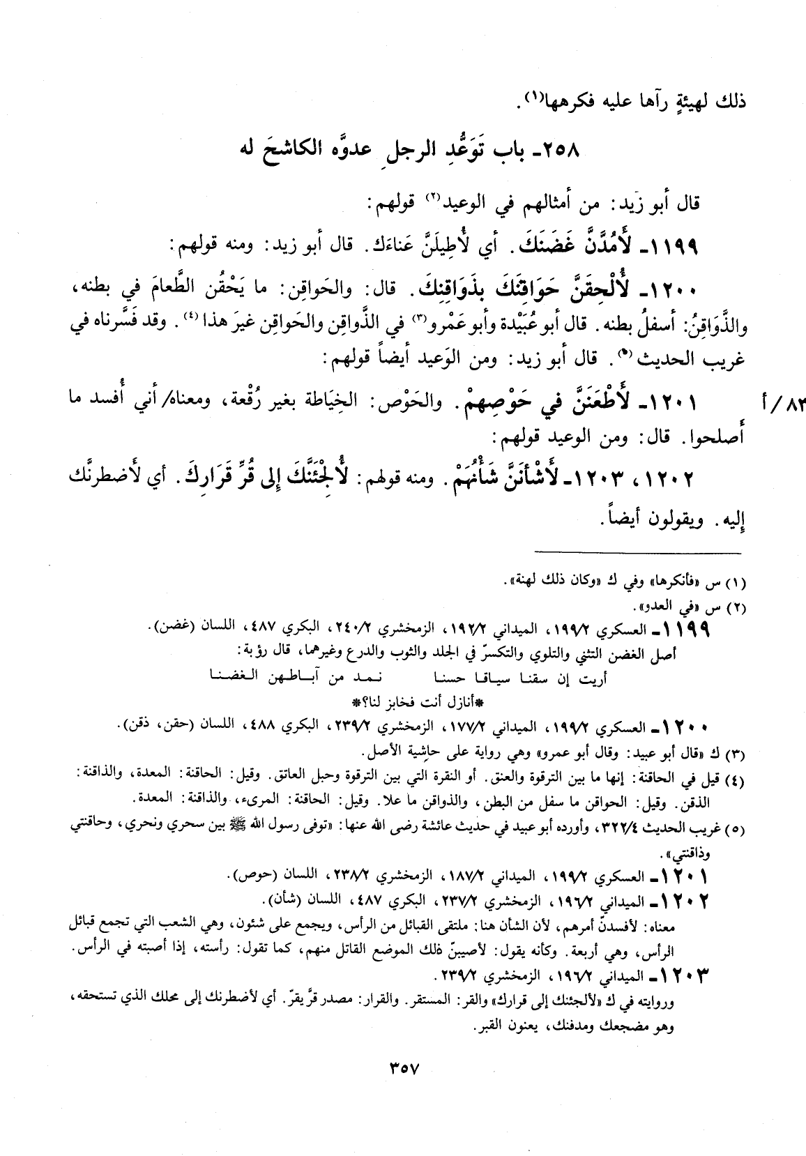 قال: الحواقن: ما يحقن الطعام في بطنه، والذواقن: اسفل بطنه. قال أبو عبيدة وأبو عمرو في الذواقن والحوافن غير هذا. وقد فسرناه في غريب الحديث. قال أبو زيد: ومن الوعيد قولهم: لأطعنن في حوصهم.