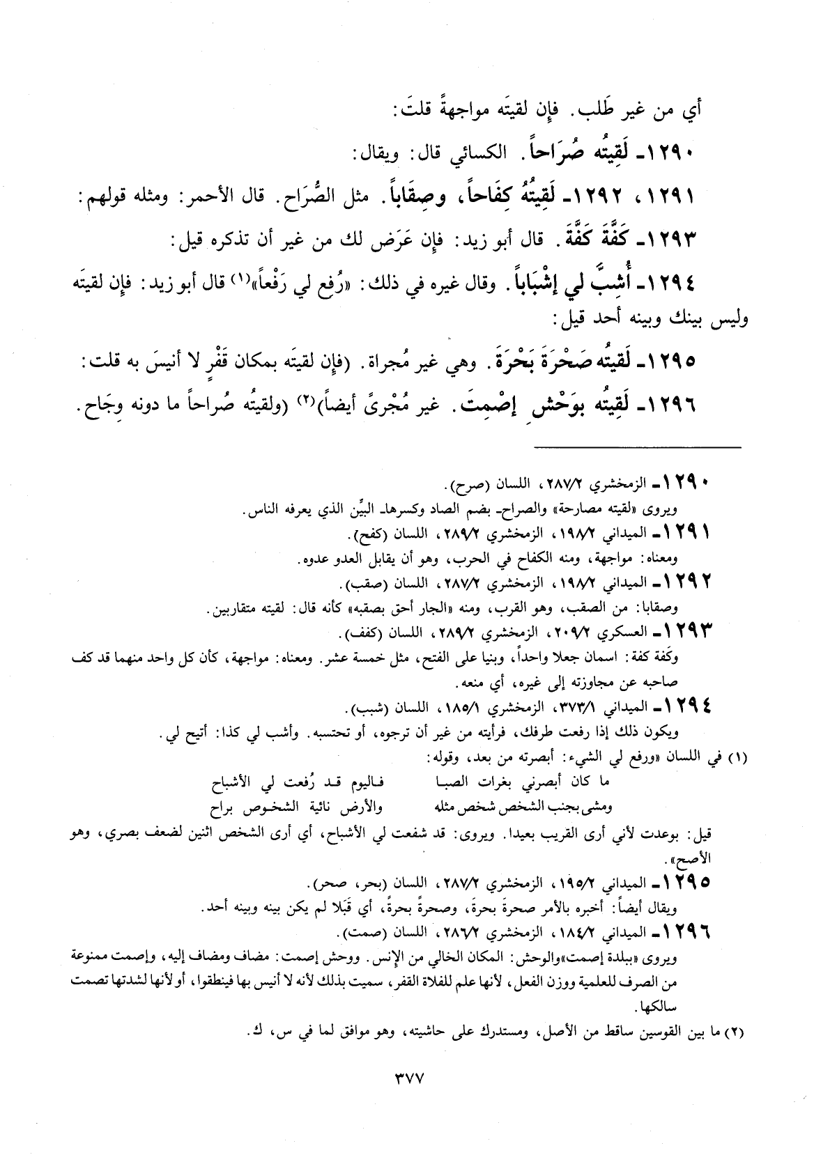 مثل الصراح. قال الأحمر. ومثله قولهم: أشب لي إشباباً وقال غيره في ذلك: " رفع لي رفعاً " قال أبو زيد: فإنَّ لقيته وليس بينك وبينه أحد قيل: لقيته صحرة بحرة.