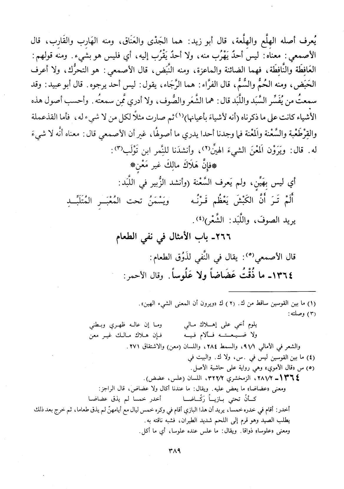 يريد الصوف، واللبد: الشعر - باب الأمثال في نفي الطعام قال الأصمعي: باب في النفي لذوق الطعام: ما ذقت عضاضاً ولا علوساً.