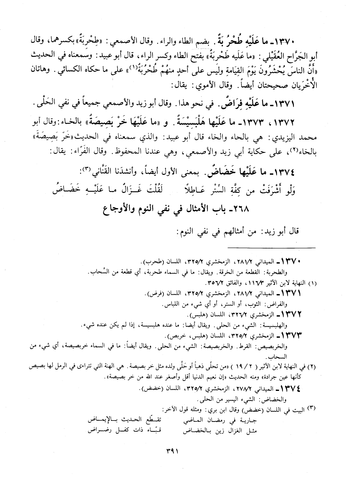 وقال الأصمعي: " طرحبة " بكسرهما، وقال أبو الجراح العقلي: " ما عليه طرحبة " بفتح الطاء وكسر الراء، قال أبو عبيد: وسمعناه في الحديث " أنَّ الناس يحشرون يوم القيامة وليس على أحد منهم طحربة " على ما حكاه الكسائي. وهاتان الأخريان صحيحتان أيضاً. وقال الأموي: يقال: ما عليه فراض.