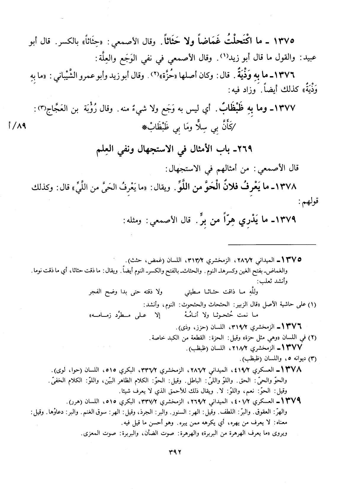 وقال الأصمعي: " حثاثاً " بالكسر. قال أبو عبيد: والقول ما قال أبو زيد: وقال الأصمعي: في نفي الوجع والعلة: ما به وذية قال: وكان أصلها " حزة ". وقال أبو زيد: وأبو عمرو الشيباني: " ما به وذية " كذلك أيضاً. وزاد فيه: وما له ظبظاب.
