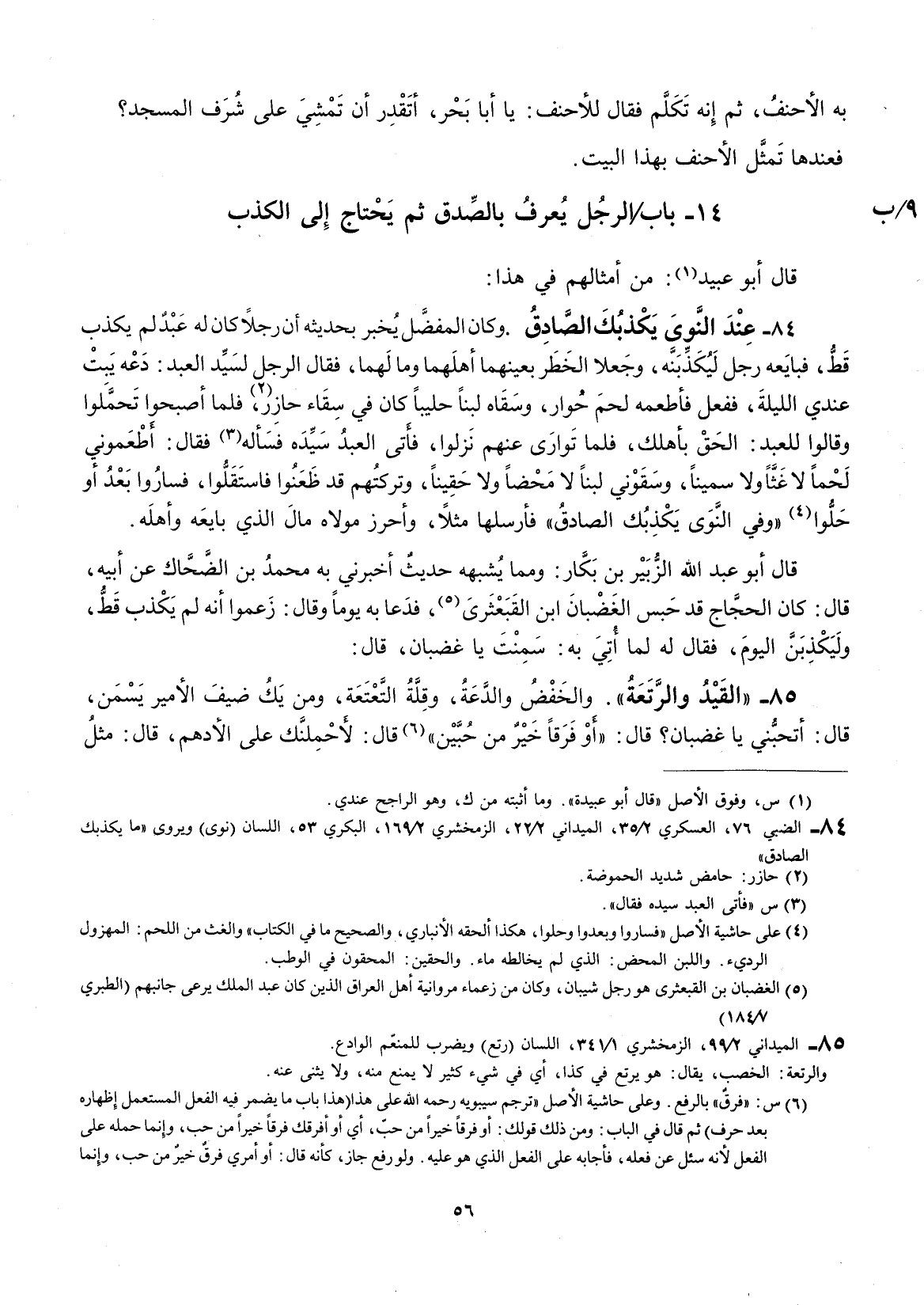 وكان المفضل يخبر بحديثه أنَّ رجلاً كان له عبد لم يكذب قط، فبايعه رجل ليكذبنه، وجعلا الخطر بينهما أهلهما ومالهما، فقال الرجل لسيد العبد: دعه يبت عندي الليلة، ففعل فأطعمه لحم حوار وسقاه لبناً حليباً في سقاء حازر فلما أصبحوا تحملوا وقالوا للعبد: الحق بأهلك، فلما توارى عنهم نزلوا، فأتى العبد سيده فسأله فقال: أطعموني لحماً لا غثاً ولا سميناً وسقوني لبناً لا محمضاً ولا حقيناً وتركتهم قد ظعنوا فاستقلوا فساروا بعد أو حلوا " وفي النوى يكذبك الصادق " فأرسلها مثلاً وأحرز مولاه مال الذي بايعه وأهله.