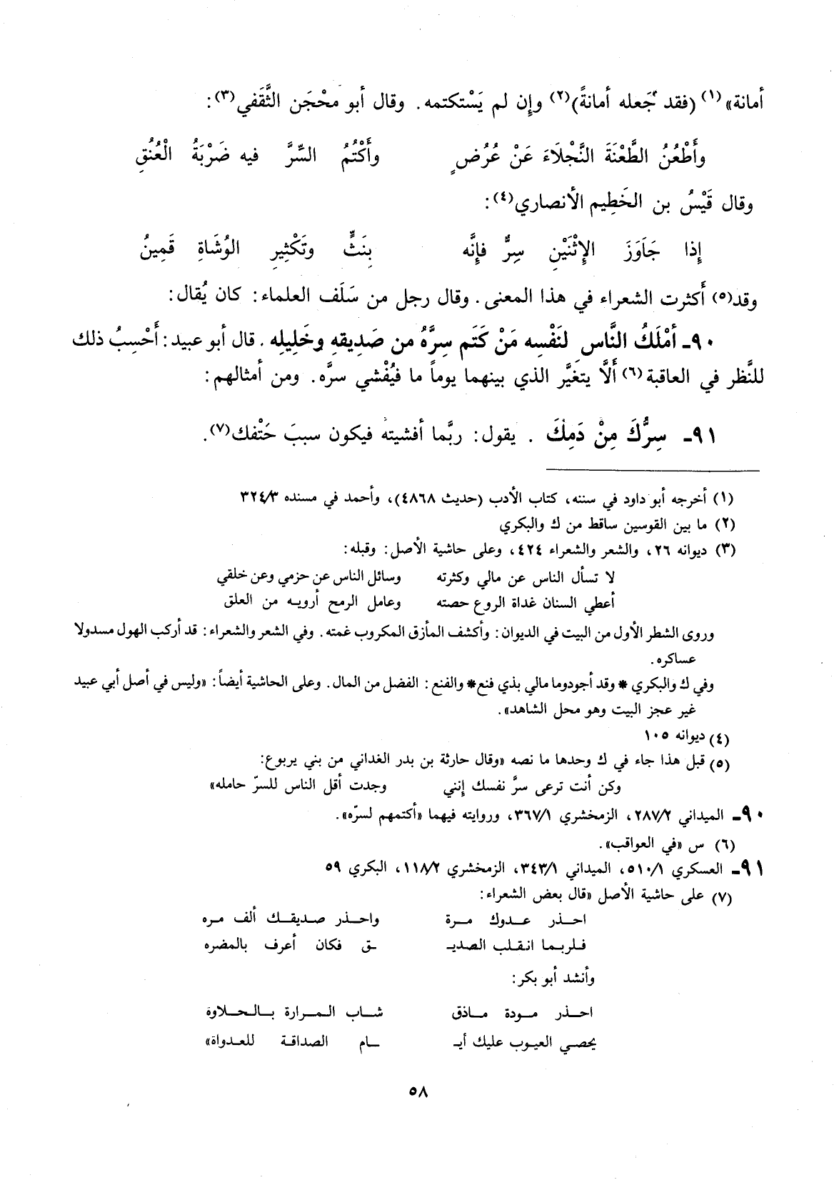 وقد أكثرت الشعراء في هذا المعنى. وقال رجل من سلف العلماء: كان يقال: أملك الناس لنفسه من كتم سره من صديقه وخليله.