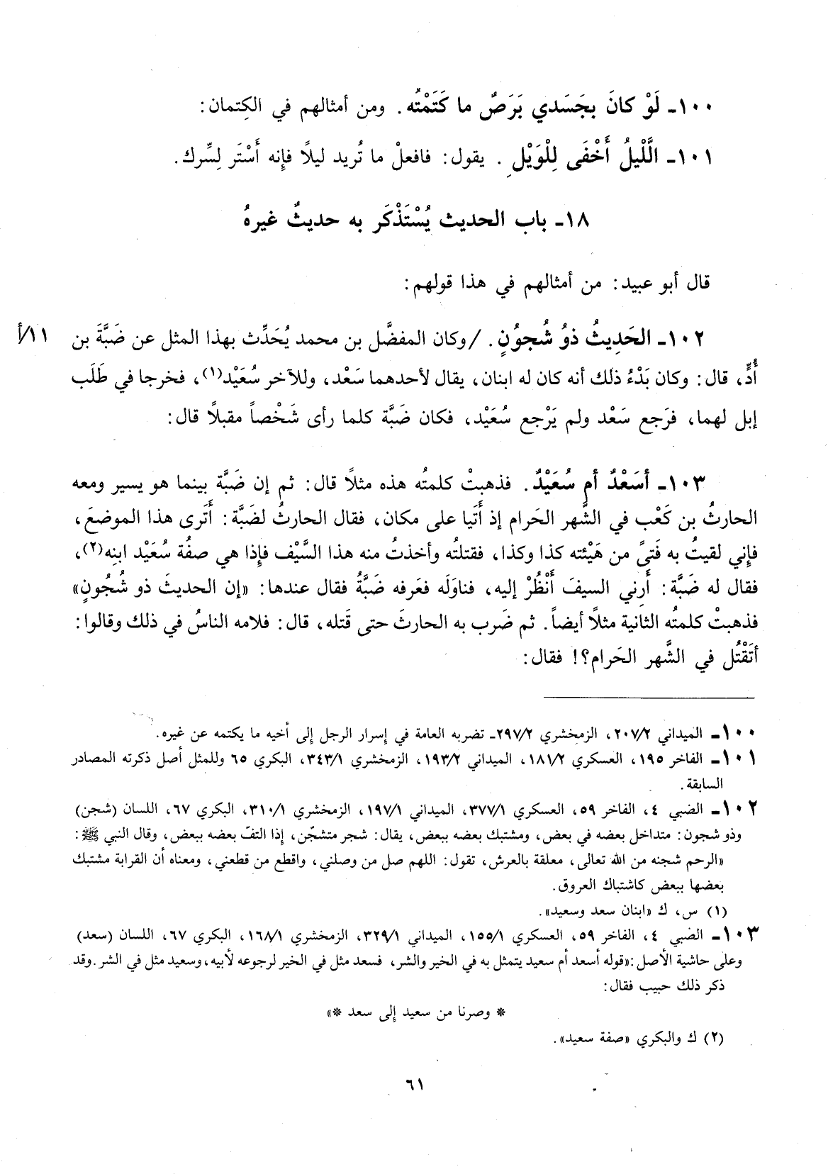 فذهبت كلمته هذه مثلا قال: ثم إنَّ ضبة بينما هو يسير ومعه الحارث بن كعب في الشهر الحرام إذ أتيا على مكان، فقال الحارث بضبة: أترى هذا الموضع، فإني لقيت به فتى من هيئته كذا وكذا فقتلته وأخذت منه هذا السيف فإذا هي صفة سعيد ابنه، فقال له ضبة: أرني السيف أنظر إليه، فناوله فعرفه ضبة فقال عندها: " إنَّ الحديث ذو شجون " فذهبت كلمته الثانية مثلا أيضاً. ثم ضرب به الحارث حتى قتله، قال: فلامه الناس في ذلك وقالوا: أتقتل في الشهر الحرام؟ فقال: