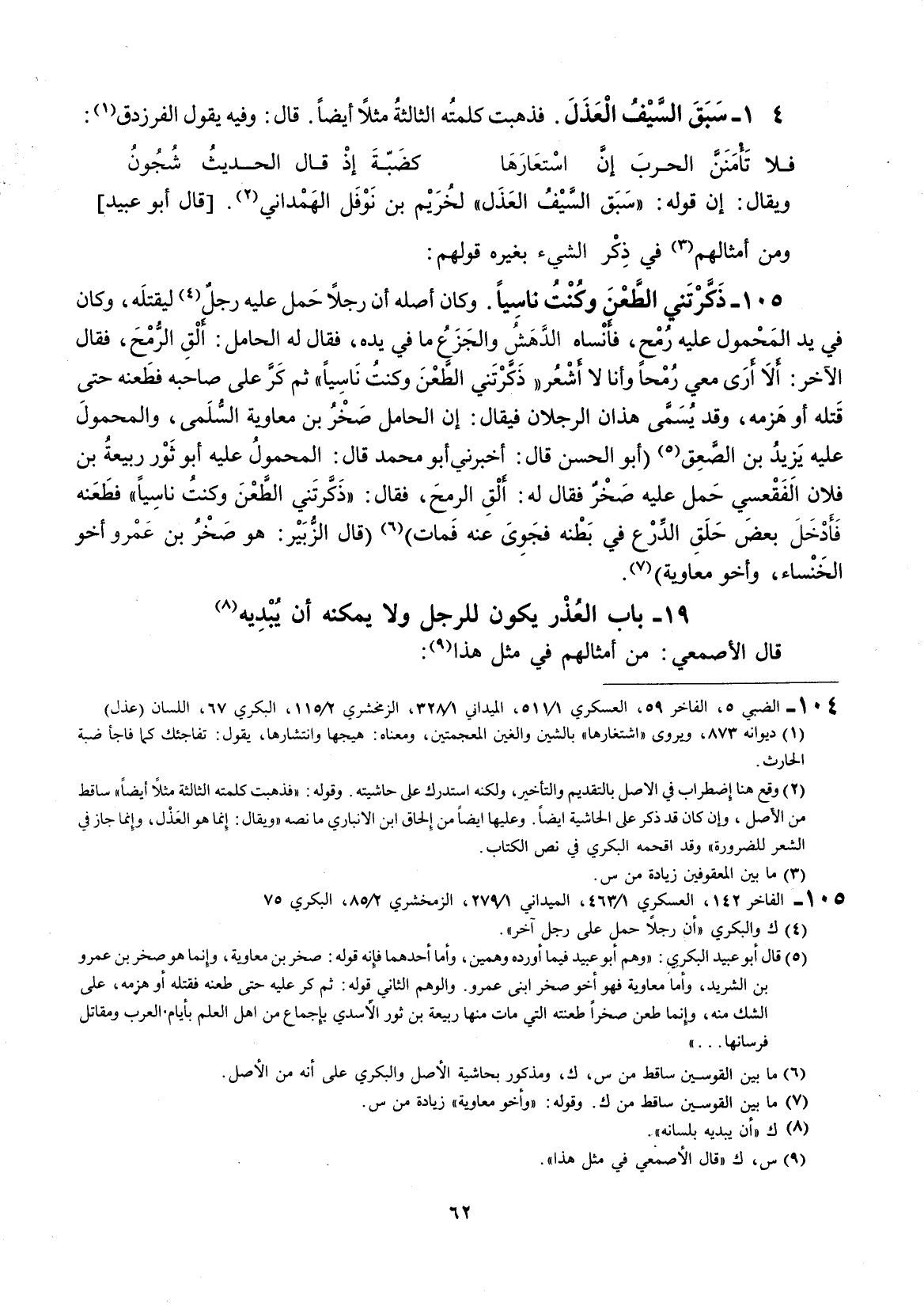 ويقال: إنَّ قوله: " سبق السيف العذل " لخزيم بن نوفل الهمذاني. قال أبو عبيد: ومن أمثالهم في ذكر الشيء بغيره قولهم: ذكرتني الطعن وكنت ناسياً.