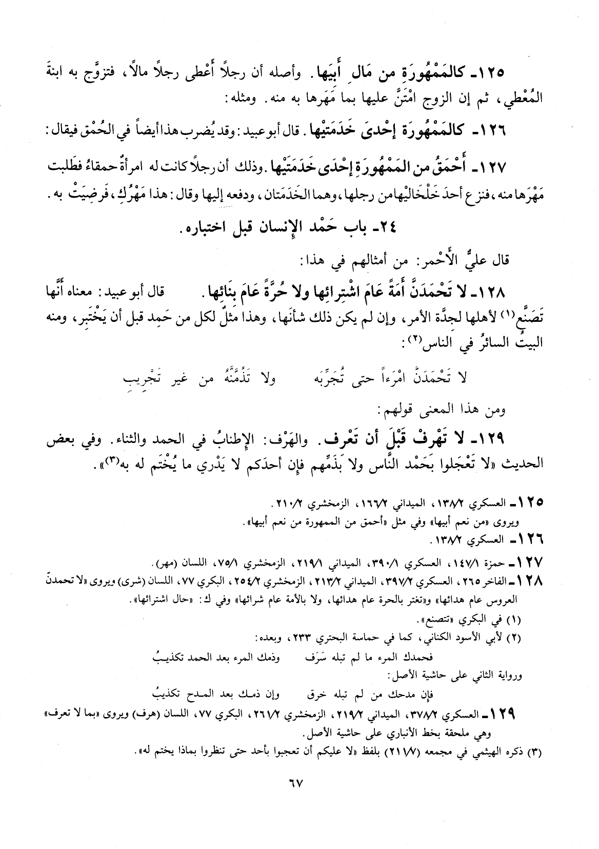 قال عليٌّ الأحمر: من أمثالهم في هذا: لا تحمدن أمةً عام اشتريتها ولا حرة عام بنائها.