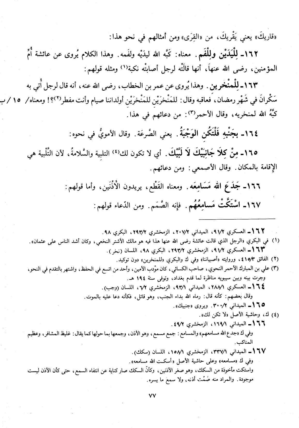 وهذا يروى عن عمر بن الخطاب، رضي الله عنه، إنّه قال لرجل أتي به سكران في شهر رمضان، فعاقبه وقال: للمنخرين للمنخرين، أولداننا صيام وأنت مفطر؟! ومعناه كبه الله لمنخريه. وقال الأحمر: من دعائهم في هذا.