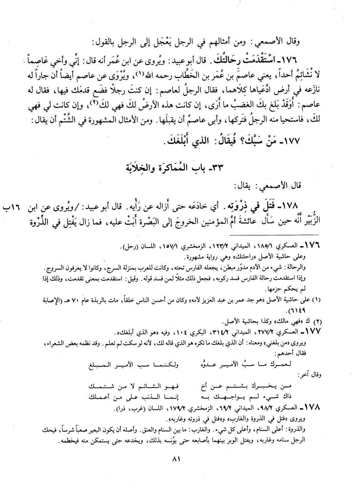 قال أبو عبيد: ويروى عن أبن عمر إنّه قال: إني وأخي عاصماً لا أشتم أحداً، يعني عاصم بن عمر بن الخطاب رحمه الله، ويروى عن عاصم أيضاً إنَّ جاراً له نازعه في أرض ادعياها من كلاهما، فقال الرجل لعاصم: إنَّ كنت رجلاً فضع قدمك فيها، فقال له عاصم: أوقد بلغ بك الغضب ما أرى إنَّ كانت هذه الأرض لك، وإنَّ كانت لي فهي لك، فاستحيا منه الرجل فتركها: وأبى عاصم أنَّ بقبلها. ومن الأمثال المشهورة في الشتم أنَّ يقال: