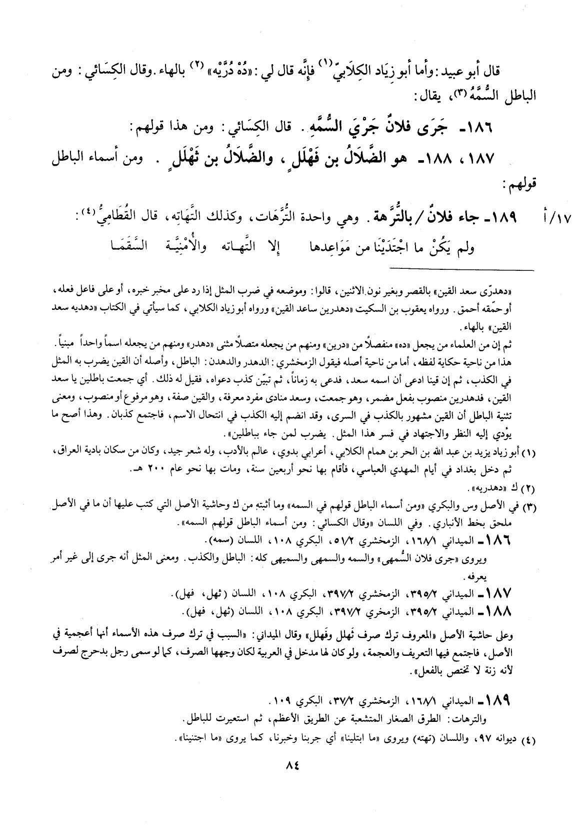 قال أبو عبيد: وأما أبو زياد الكلابي فانه قال لي: " ده دريه " بالهاء. وقال الكسائي: ومن الباطل، يقال: جرى فلان جري السمه.
