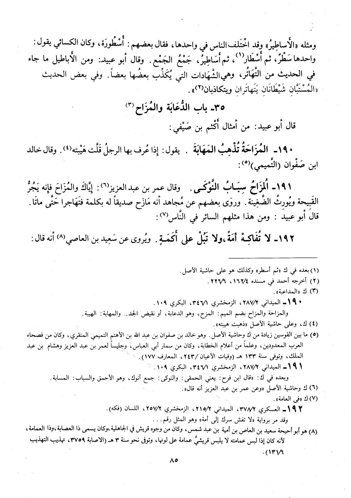 وقال عمر بن عبد العزيز: إياك والمزاح فانه يجر القبيحة ويورث الضغينة. وروى بعضهم عن مجاهد إنّه مازح صديقا له بكلمة فتهاجرا حتى ماتا. قال أبو عبيد: ومن هذا مثلهم السائر في الناس: لا تفاكه أمه، ولا تبل على أكمةٍ.