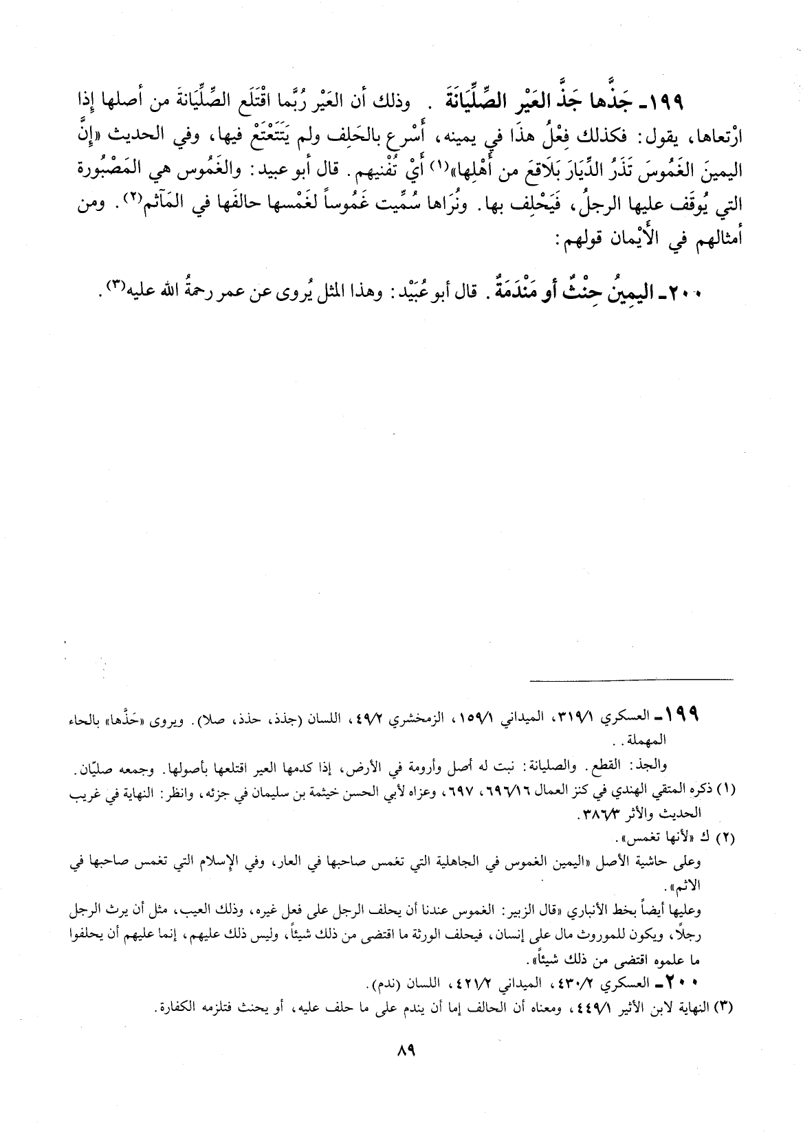 وذلك إنَّ العي ربما اقتلع الصليانة من اصلها إذا أرتعها، يقول: فذلك فعل هذا في يمينه، أسرع بالحلف ولم يتتعتع فيها، وفي الحديث " إنَّ اليمين الغموس تذر الديار بلاقع من أهلها " أي تنفيهم. قال أبو عبيد: والغموس هي المصبورة التي يوقف عليها الرجل، يحلف بها. ونراها سميت غموسا لغمسها حالفها في المآثم ومن أمثالهم في الإيمان قولهم: اليمن حنث أو مندمة.