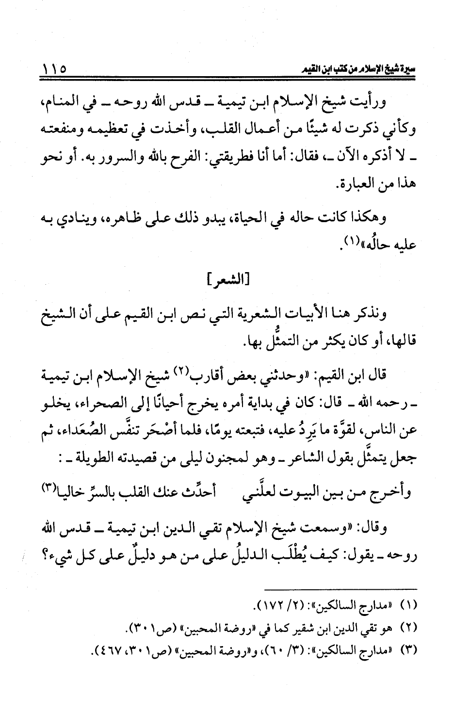 قال ابن القيم: «وحدثني بعض أقارب (¬2) شيخ الإسلام ابن تيمية - رحمه الله - قال: كان في بداية أمره يخرج أحيانًا إلى الصحراء، يخلو عن الناس، لقوَّة ما يَرِدُ عليه، فتبعته يومًا، فلما أصْحَر تنفَّس الصُعَداء، ثم جعل يتمثَّل بقول الشاعر - وهو لمجنون ليلى من قصيدته الطويلة -: