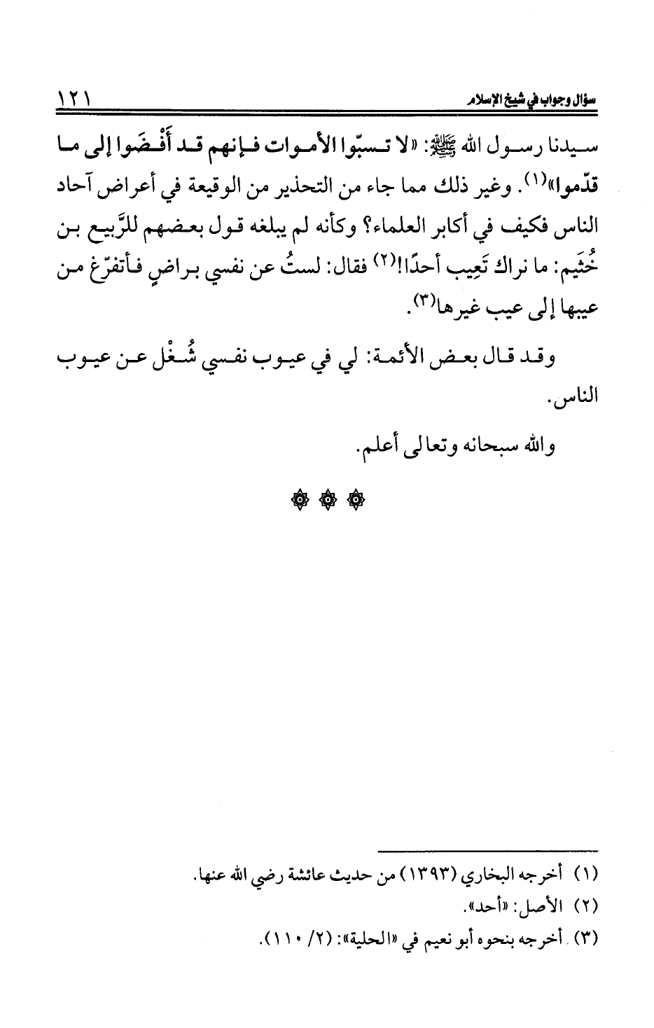 سيدنا رسول الله صلى الله عليه وسلم: «لا تسبّوا الأموات فإنهم قد أَفْضَوا إلى ما قدّموا» (¬1). وغير ذلك مما جاء من التحذير من الوقيعة في أعراض آحاد الناس فكيف في أكابر العلماء؟ وكأنه لم يبلغه قول بعضهم للرَّبيع بن خُثَيم: ما نراك تَعِيب أحدًا! (¬2) فقال: لستُ عن نفسي براضٍ فأتفرّغ من عيبها إلى عيب غيرها (¬3).