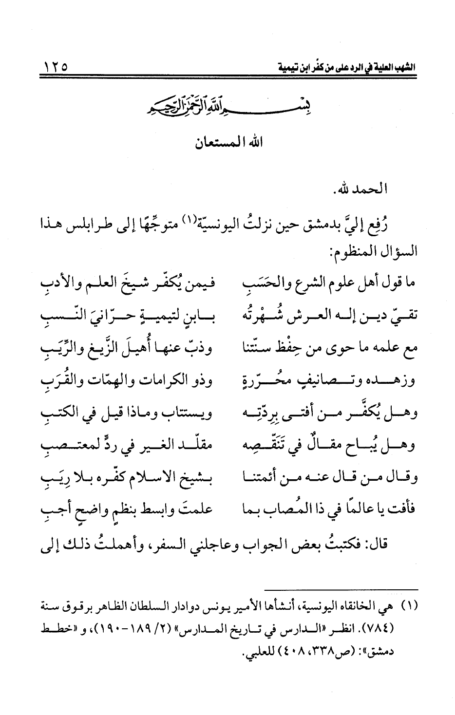تقيّ دين إله العرش شُهْرتُه ... بابنٍ لتيميةٍ حرّانيَ النّسبِ