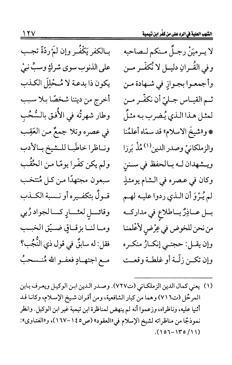 (¬1) يعني كمال الدين الزملكاني (ت 727). وصدر الدين ابن الوكيل ويعرف بابن المرحِّل (ت 716) وهما من كبار الشافعية، ومن أقران شيخ الإسلام، وكانا قد أثنيا عليه، وناظراه، وزعموا أنه لم ينهض لمناظرة ابن تيمية غير ابن الوكيل. وانظر نموذجًا من مناظراته لشيخ الإسلام في «العقود» (ص 145 - 167)، و «الفتاوى»: (11/ 135 - 156).